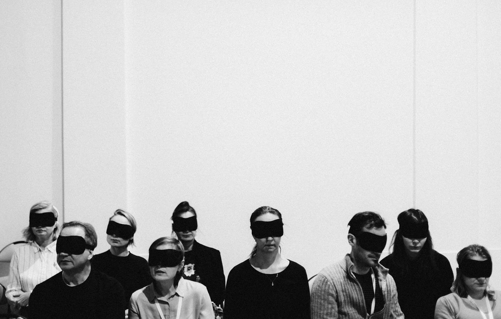 Тифлокомментарий: черно-белая фотография. В зале с белыми стенами и высоким потолком на стульях сидят мужчины и женщины в темных масках для сна на глазах. Все сосредоточенно слушают спектакль с серьезными лицами.