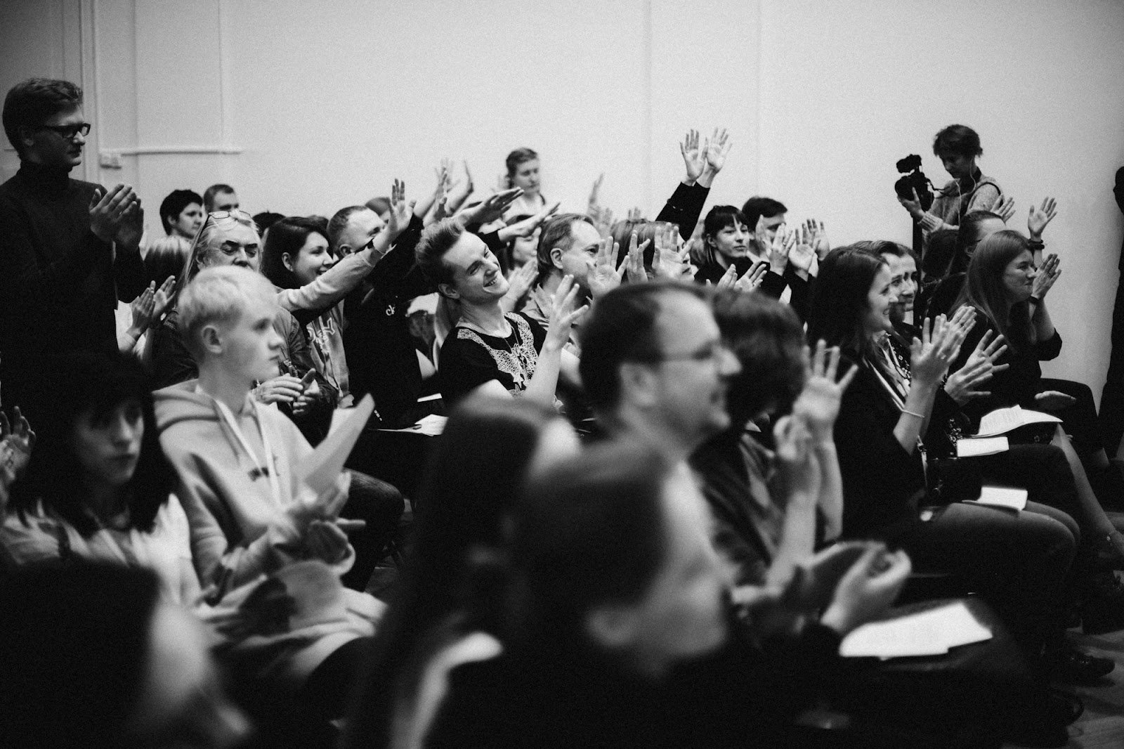 Тифлокомментарий: черно-белая фотография. Зал с белыми стенами заполнен людьми, они сидят на стульях и аплодируют. Многие из них смеются и улыбаются, некоторые подняли ладони вверх, показывая «аплодисменты» на жестовом языке. У дальней стены стоит женщина с камерой и снимает происходящее.