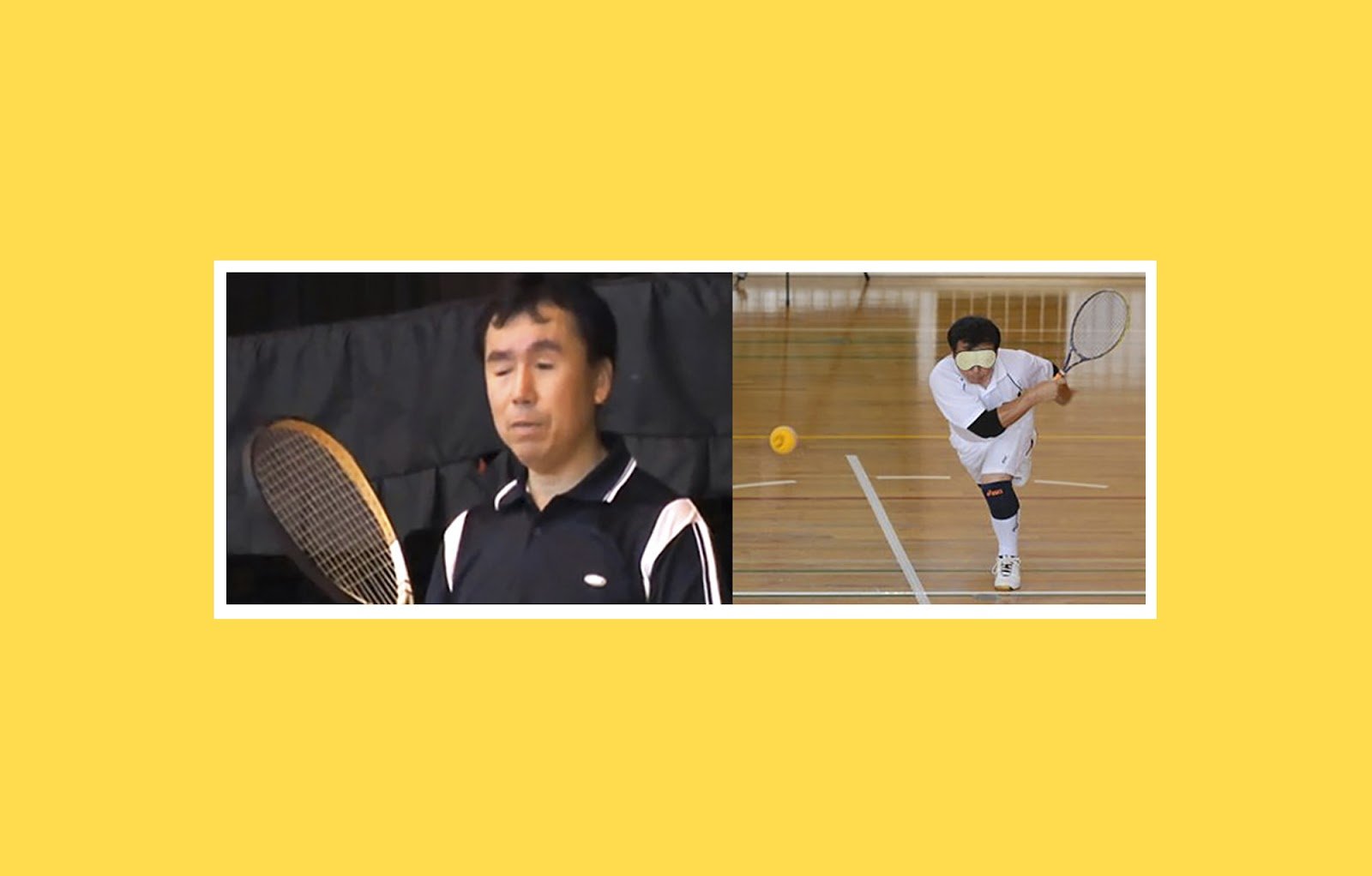 Тифлокомментарий: Коллаж из двух цветных фотографий в белой рамке на желтом фоне. На левой японец среднего возраста стоит с теннисной ракеткой в руке. Он коротко острижен, одет в спортивное темно-синее поло с белыми полосами на плечах и вдоль ворота. На второй фотографии Миоси играет в большой теннис в спортивном зале с деревянным полом. Справа от Миоси в воздухе теннисный мяч, спортсмен занес ракетку от себя, чтобы отразить подачу. На мужчине белая спортивная форма и кроссовки, черные наколенники и налокотники, на глазах белая маска.