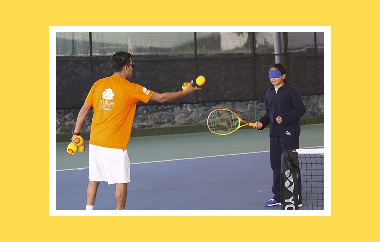 Тифлокомментарий: цветная фотография в белой рамке на желтом фоне. Тренировка на открытом теннисном корте. Слева боком стоит молодой брюнет в солнцезащитных очках. На нем широкая оранжевая футболка, белые свободные шорты. В левой опущенной руке он держит четыре теннисных мяча. В правой вытянутой руке мужчина удерживает один мяч, одновременно бросает другой стоящей напротив девушке с теннисной ракеткой. На глазах у девушки синяя маска для сна, длинные темные волосы убраны в хвост.
