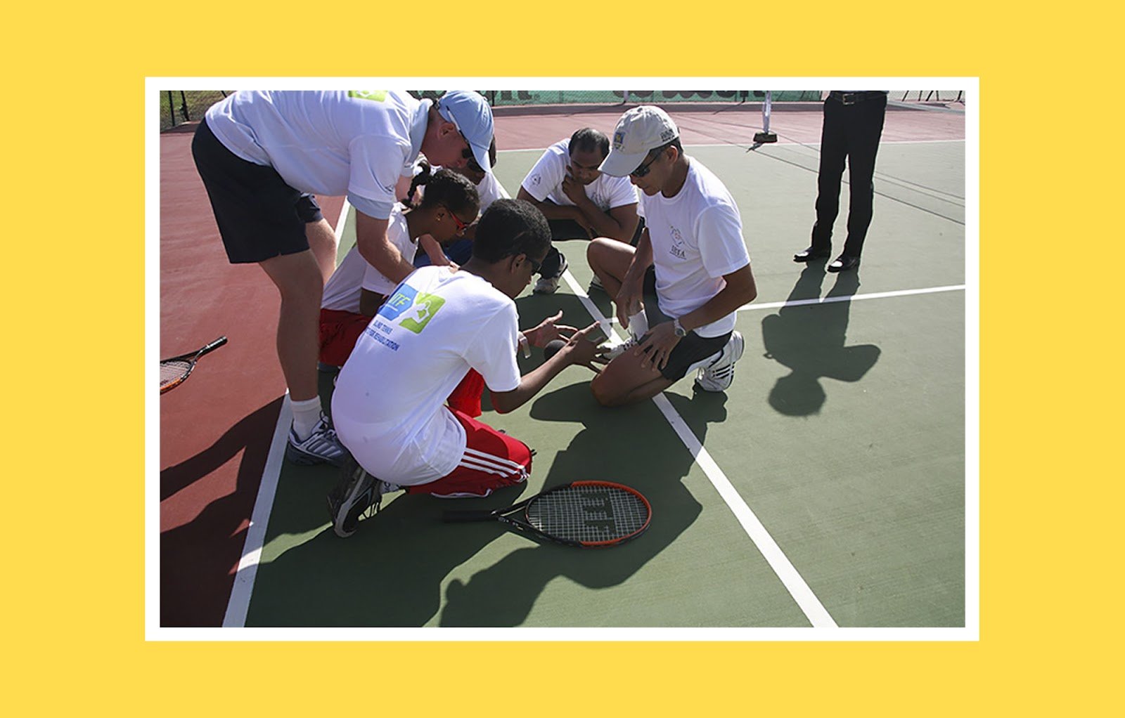 Тифлокомментарий: цветная фотография в белой рамке на желтом фоне. Ясный солнечный день. На границе открытого теннисного корта присели и что-то обсуждают в кругу шестеро спортсменов в белых футболках и солнцезащитных очках. Спиной к нам опустился на правое колено смуглый мужчина в красных шортах. Справа от него лежит теннисная ракетка с красным ободом. Мужчина активно жестикулирует, остальные внимательно его слушают. Слева от него стоит и склонился к остальным плотный мужчина в голубой бейсболке. Остальные, среди них одна девушка, сидят на корточках. От фигур на корт ложатся яркие четкие тени.