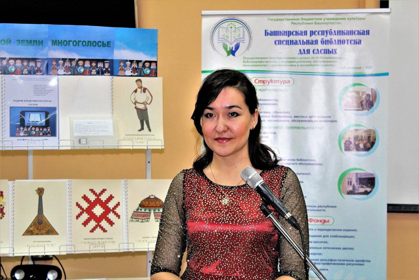 Тифлокомментарий: цветная фотография. У микрофона стоит женщина около 30 лет в красном платье со стразами и черными прозрачными рукавами, ее черные волосы присобраны на затылке. Она смотрит перед собой, немного улыбаясь. Позади нее справа вертикальный баннер с информацией о библиотеке, слева стенд с цветными рельефно-графическими пособиями о национальной культуре, на обложках музыкальные инструменты, элементы национальных костюмов и орнаментов. В верхней части стенда крупная надпись: «Родной земли многоголосье».