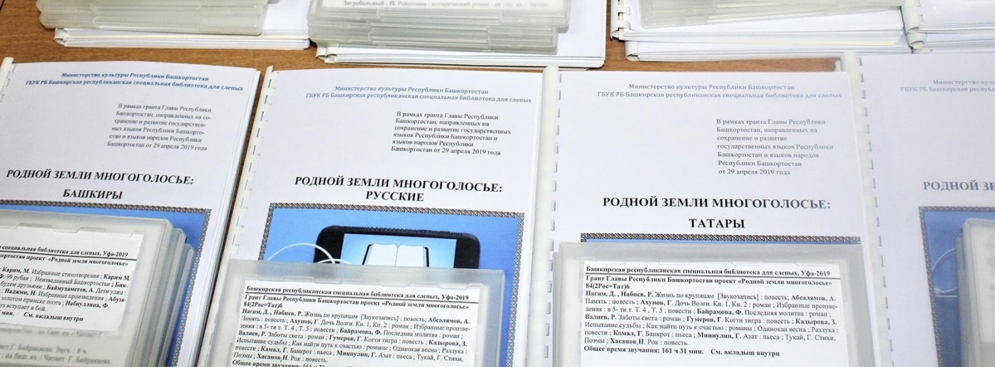 В декабре в Уфе презентовали проект «Родной земли многоголосье». Башкирская специальная библиотека для слепых издала мультиязыковые аудиокниги и разработала рельефно-графические пособия о народах Башкирии для незрячих людей, которых в регионе насчитывается более семи тысяч. Проект реализуется на грант главы республики, направленный на сохранение и развитие государственных языков региона и национальных языков этносов, проживающих на его территории (более 650 тысяч рублей).
