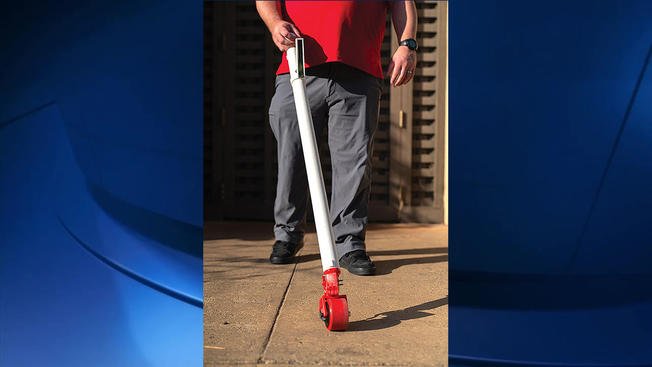 Тифлокомментарий: цветная вертикальная фотография в центре, обрамленная по краям широкими синими полосами. В правой руке крупного мужчины в красной футболке и серых свободных брюках устройство, похожее на трость. Оно представляет собой толстую длинную трубку белого цвета с выступом со стороны ручки и небольшим красным широким колесом на конце. Мужчина катит трость перед собой.