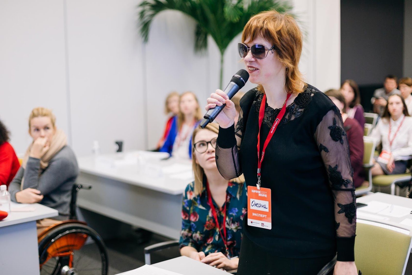 Тифлокомментарий: цветная фотография. В том же зале Оксана, поднявшись с места, говорит в микрофон. Рядом сидит ее собеседница. Другие участники сидят за серыми столами и на выстроенных рядами стульях чуть позади. Среди них блондинка в инвалидной коляске. Все смотрят на выступающую и с интересом слушают ее. На оранжевом бейджике Оксаны написано ее имя и слово “Эксперт”. Её платье украшено ажурной вставкой на круглом вырезе и полупрозрачными рукавами с черными цветочными аппликациями. Очки крупные, в тонкой оправе с фигурными дужками.