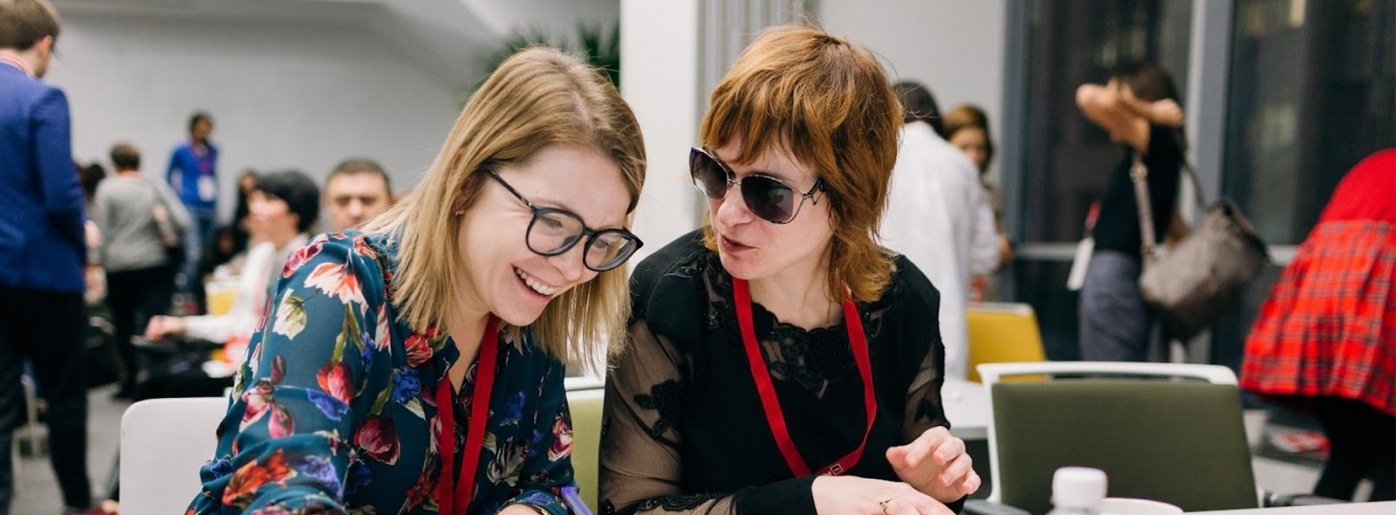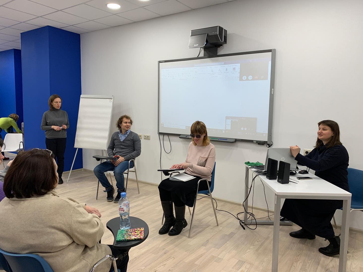 Тифлокомментарий: цветная фотография. Оксана и Иван сидят на стульях с откидным столиками перед слушателями. У Оксаны на коленях и на столике лежат бумаги. Она читает их пальцами, улыбается. На ней темные очки, розовая кофта, черные юбка ниже колен и сапоги. Иван повернулся к ней и слегка улыбается. У него русые кудрявые волосы. Он одет в синие джинсы, серый джемпер поверх голубой рубашки и черные кеды. За ними экран, на который выведена пустая страница текстового документа. Справа от экрана за белым столом сидит брюнетка в черном длинном наряде. Перед ней серый ноутбук и колонки. Слева от экрана флипчарт. Рядом стоит женщина в черной юбке и серой кофте с маркером в руках. Стены помещения светлые с синими выступающими коробами от пола до потолка.