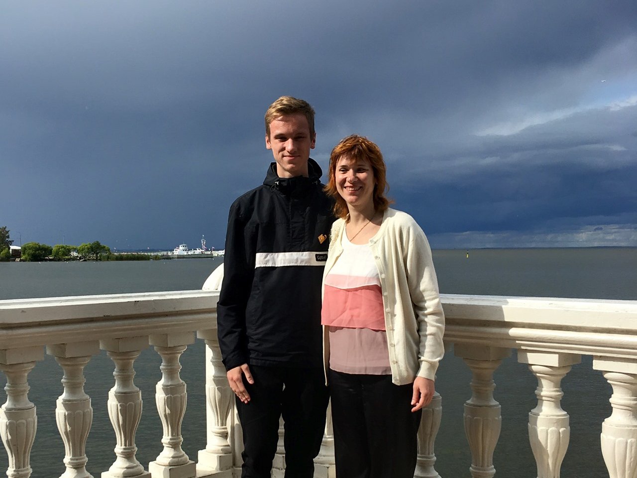 Тифлокомментарий: цветная фотография. Оксана с сыном стоят приобнявшись на набережной и улыбаются. Андрей худощавый, высокий, на полголовы выше Оксаны. У него русые короткие волосы, черты лица повторяют мамины: высокий лоб, маленькие глубоко посаженные глаза, курносый нос, тонкие губы. Одет в черный спортивный костюм с белой полосой на груди. Оксана без очков, волосы слегка взъерошены. На ней черные брюки и бежевый джемпер на пуговицах поверх легкой бело-розовой кофты. За серой гладью воды слева виднеются белые невысокие постройки и кустистые деревья. Небо затянуто слоистыми серо-синими облаками с голубыми просветами. Лица Оксаны и Андрея залиты мягким солнечным светом.