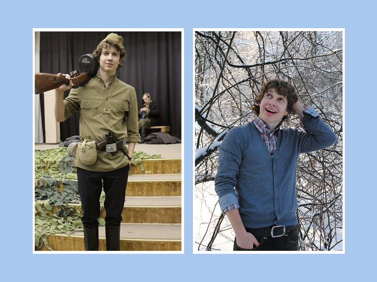 Тифлокомментарий: коллаж из двух цветных фотографий на голубом фоне. На обеих Иван еще подросток. На первой он в образе советского солдата в гимнастерке, на ремне с тяжелой бляхой закреплен подсумок с гранатами и пистолет. Русые кудри Ивана выбиваются из-под пилотки с красной звездой. Правой рукой он вскинул на плечо пистолет-пулемет, левую засунул в карман. Иван улыбается. Он стоит на широких ступенях, ведущих на сцену с черным занавесом. Часть ступеней укрыта военной камуфляжной сеткой.