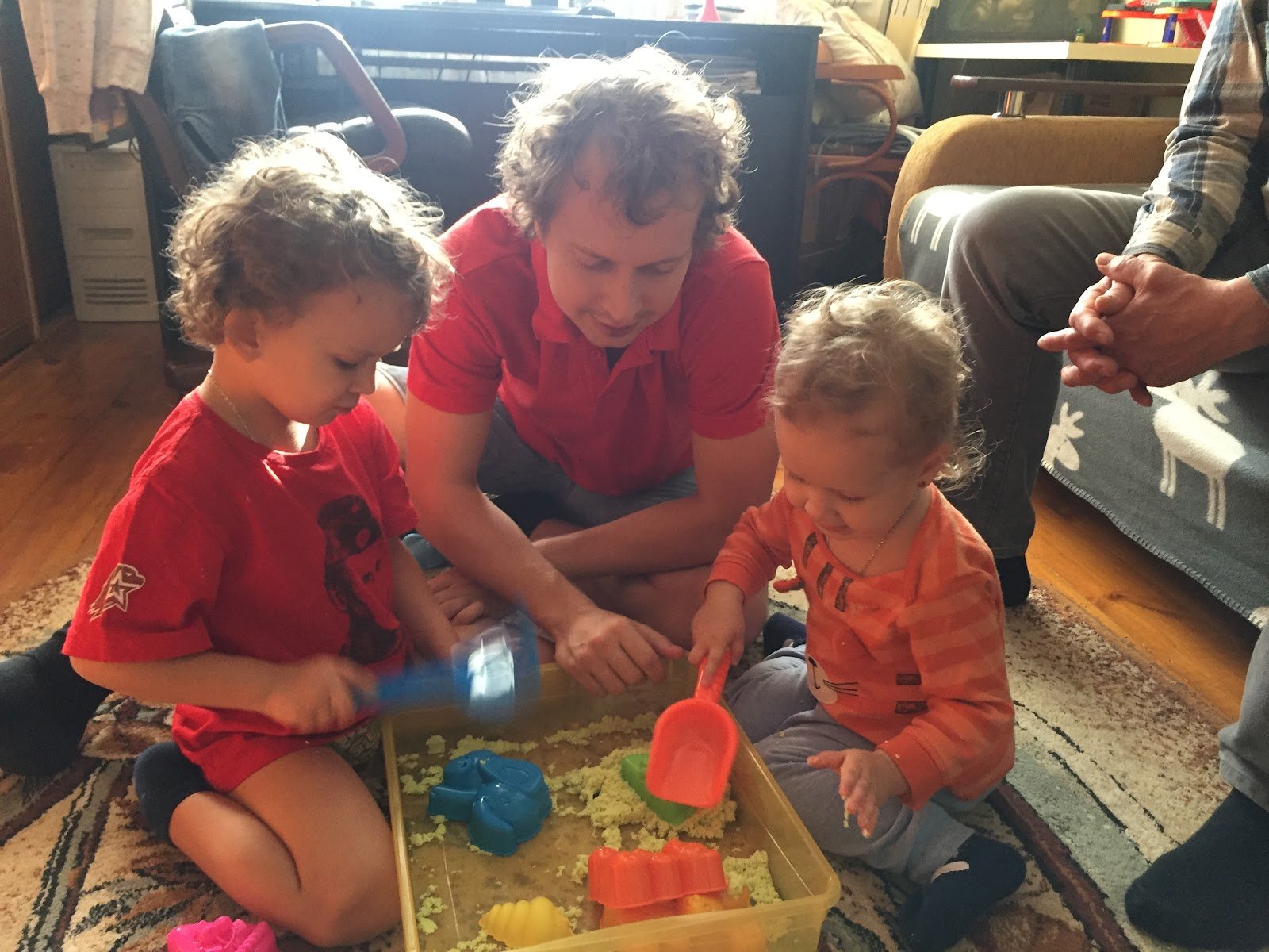 Тифлокомментарий: цветная фотография. Иван сидит на ковре и играет с детьми в домашнюю песочницу. Справа от него мальчик лет трех, слева полуторогодовалая девочка. У всех троих одинаковые русые кудри. Перед ними в центре стоит большой прямоугольный контейнер с песочной массой для лепки и разноцветными формочками. Дети увлеченно орудуют пластмассовыми лопатками. Справа на диване сидит, сложив руки в замок, мужчина. Позади компьютерный стол.