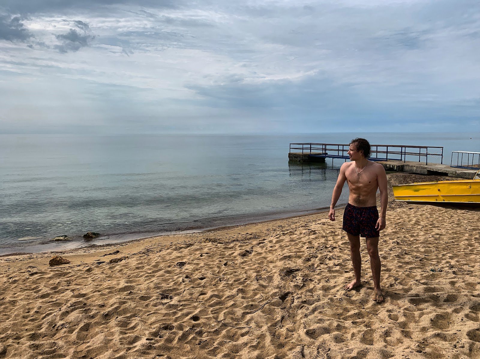 Тифлокомментарий: цветная фотография. Морской пейзаж. Иван стоит на пустынном песчаном берегу и смотрит в морскую даль. На нем черные пляжные шорты выше колена. Тело Ивана подтянутое, тренированное, с хорошо развитыми мышцами груди и живота. Небо затянуто слоистыми серо-голубыми облаками. Линия горизонта между небом и серой водной гладью почти неразличима. Позади Ивана на берегу лежит корпус желтой лодки, перпендикулярно в воду уходит небольшой деревянный пирс с металлическими ограждениями.