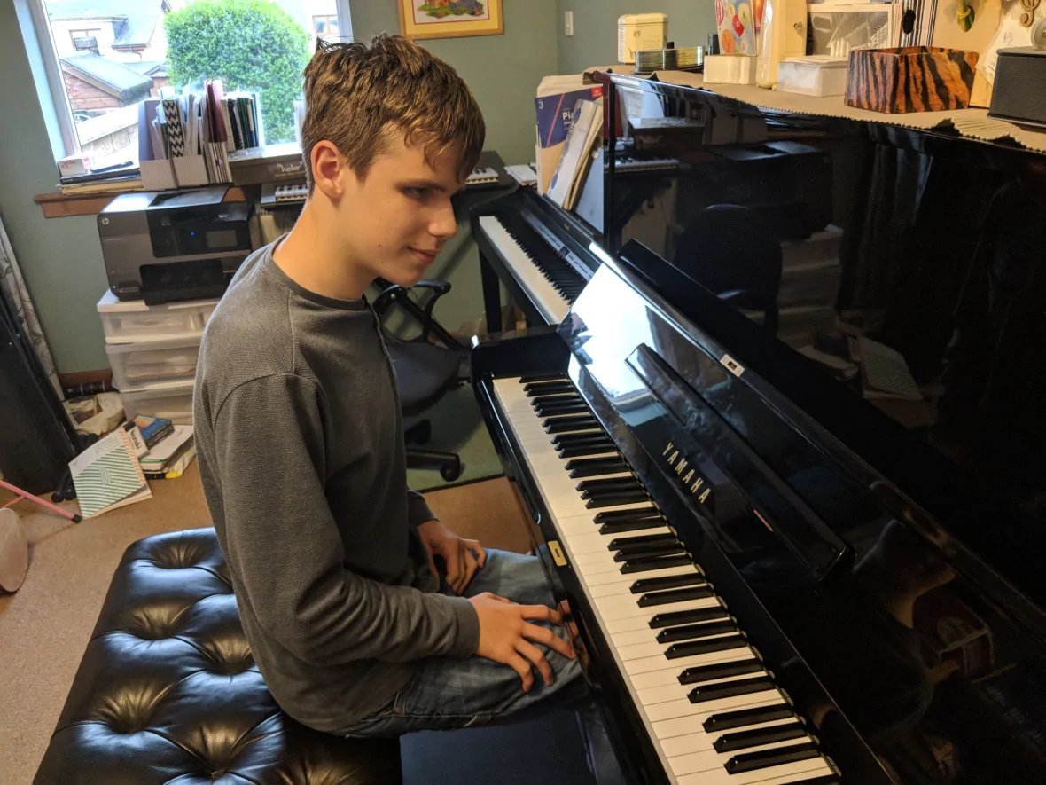 Тифлокомментарий: цветная фотография. Музыкальный класс. За черным фортепиано сидит парень лет 14 с короткими русыми волосами и расфокусированным взглядом. Это Итан Лок. Он держит руки на бедрах, слегка улыбается. На нем серый джемпер и синие джинсы. Черная банкетка, на которой сидит Итан, декорирована пуговицами, утопленными в мягкую поверхность. Позади стоит еще одно черное фортепиано и синтезатор. На инструментах лежат шкатулки разных форм и расцветок. У окна стоит принтер и папки с документами. Несколько папок лежат на полу. За окном видны крыши мансард и пышные зеленые кроны.