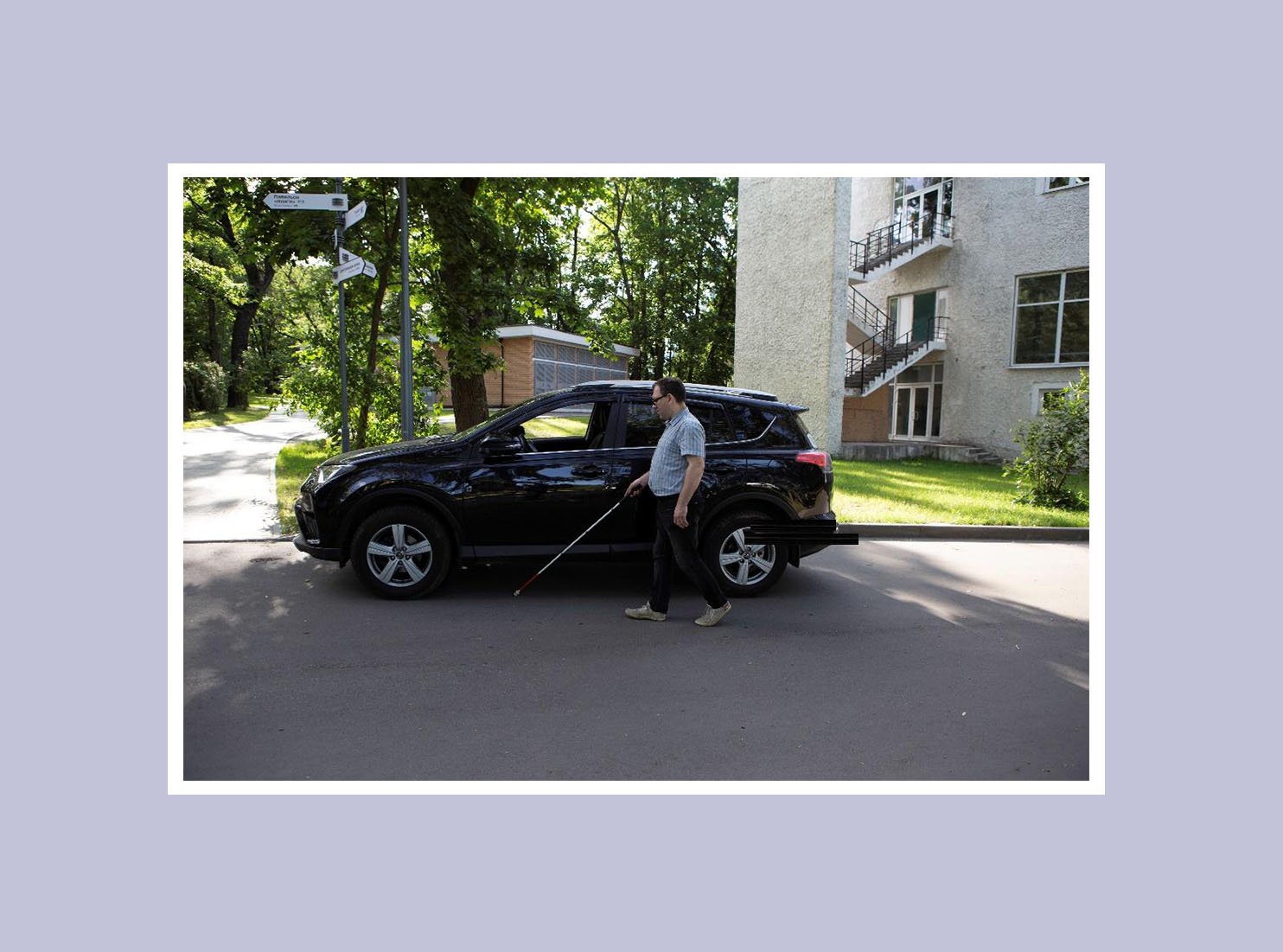 Тифлокомментарий: цветная фотография в широкой сиреневой рамке. Лето. Двор жилого дома. По проезжей части во дворе, рядом с припаркованной черной иномаркой идет мужчина в темных очках и с белой тростью. Тростью он касается днища машины. За автомобилем — зеленый газон и угол дома.