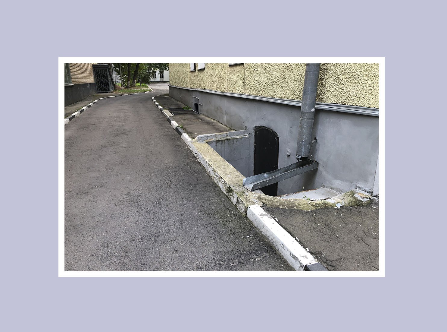 Подниматься на бордюр или газон можно только в том случае, если есть время осмотреть поверхность тростью и убедиться, что поверхность ровная и безопасная. Ниже на фотографии приведен пример ситуации, когда бордюр переходит в бетонный край входа в подвальное помещение. Глубина — больше двух метров.