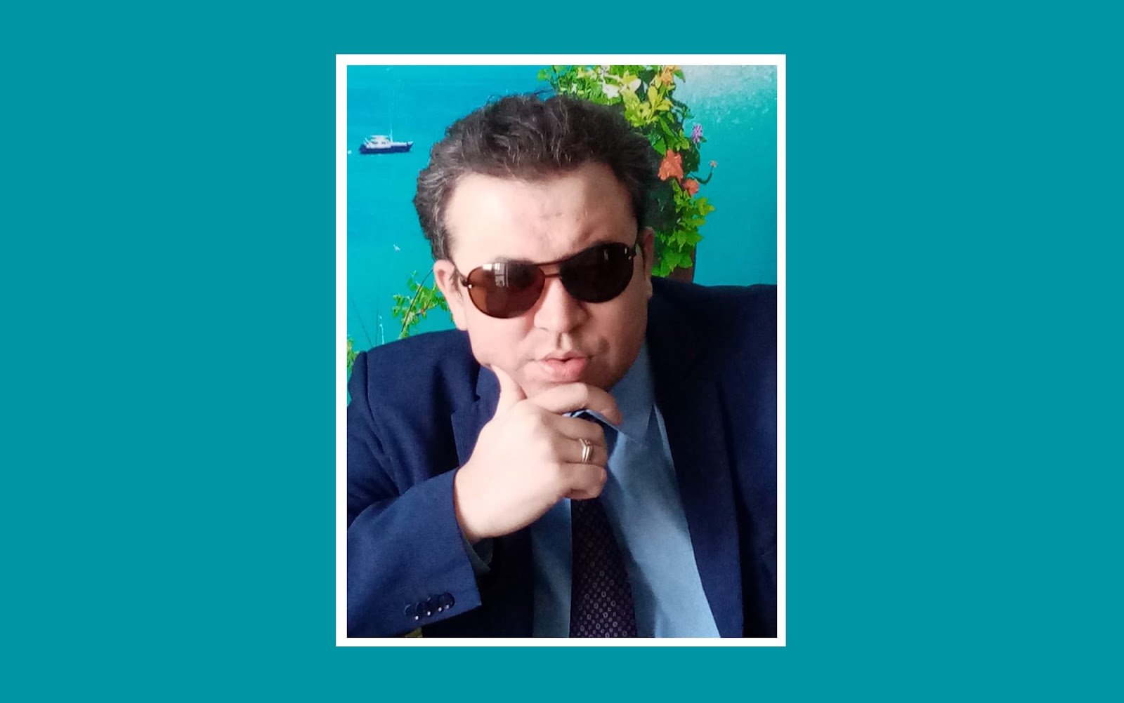 Тифлокомментарий: цветная фотография. На портрете Рустем Шарапов — мужчина с темными вьющимися волосами, зачесанными назад. Он сидит, подперев подбородок пальцами правой руки. На Рустеме темные очки, синий классический пиджак, голубая рубашка и темно-синий галстук в тон пиджаку.
