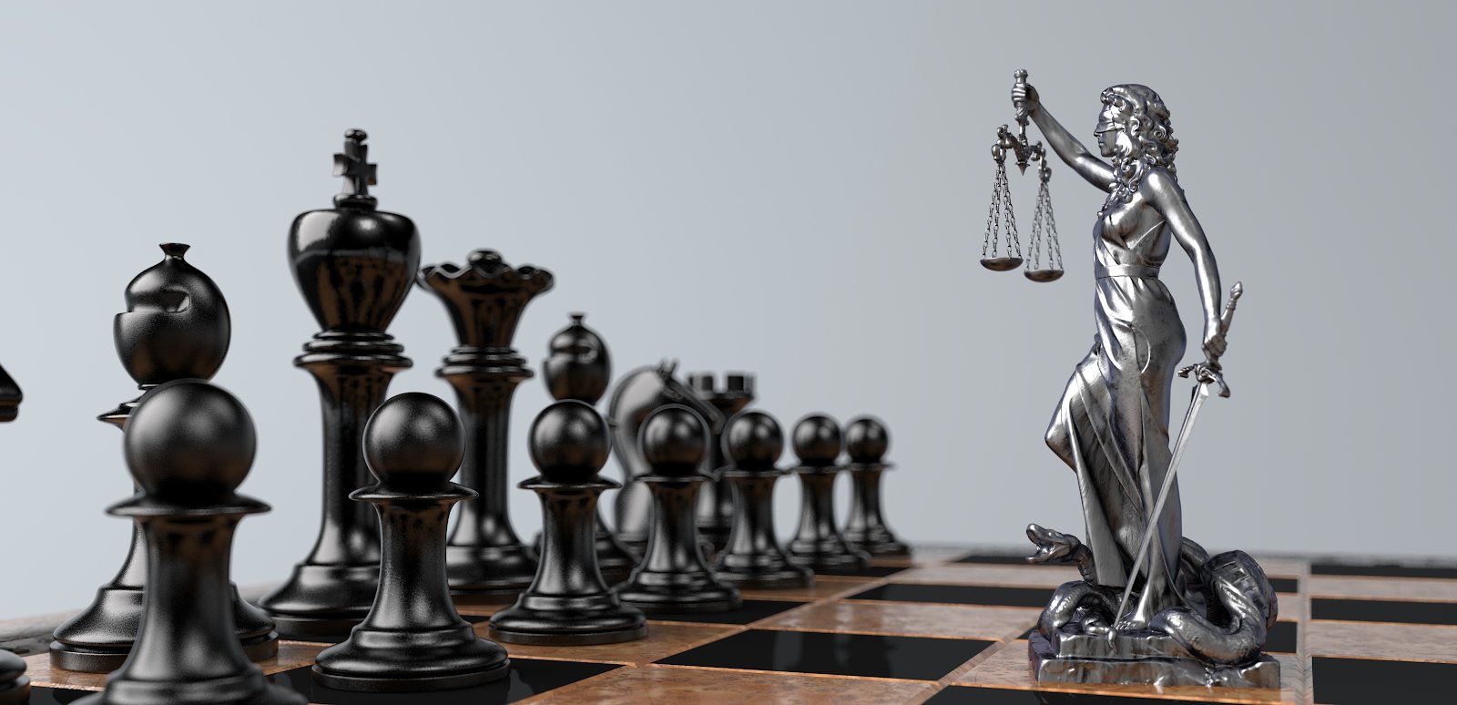 Тифлокомментарий: цветная фотография. На шахматной доске напротив черных фигур стоит статуэтка Фемиды. В правой вытянутой вперед руке богиня держит весы, в левой — меч. Подножие статуэтки обвивает змея с хищно открытым ртом.