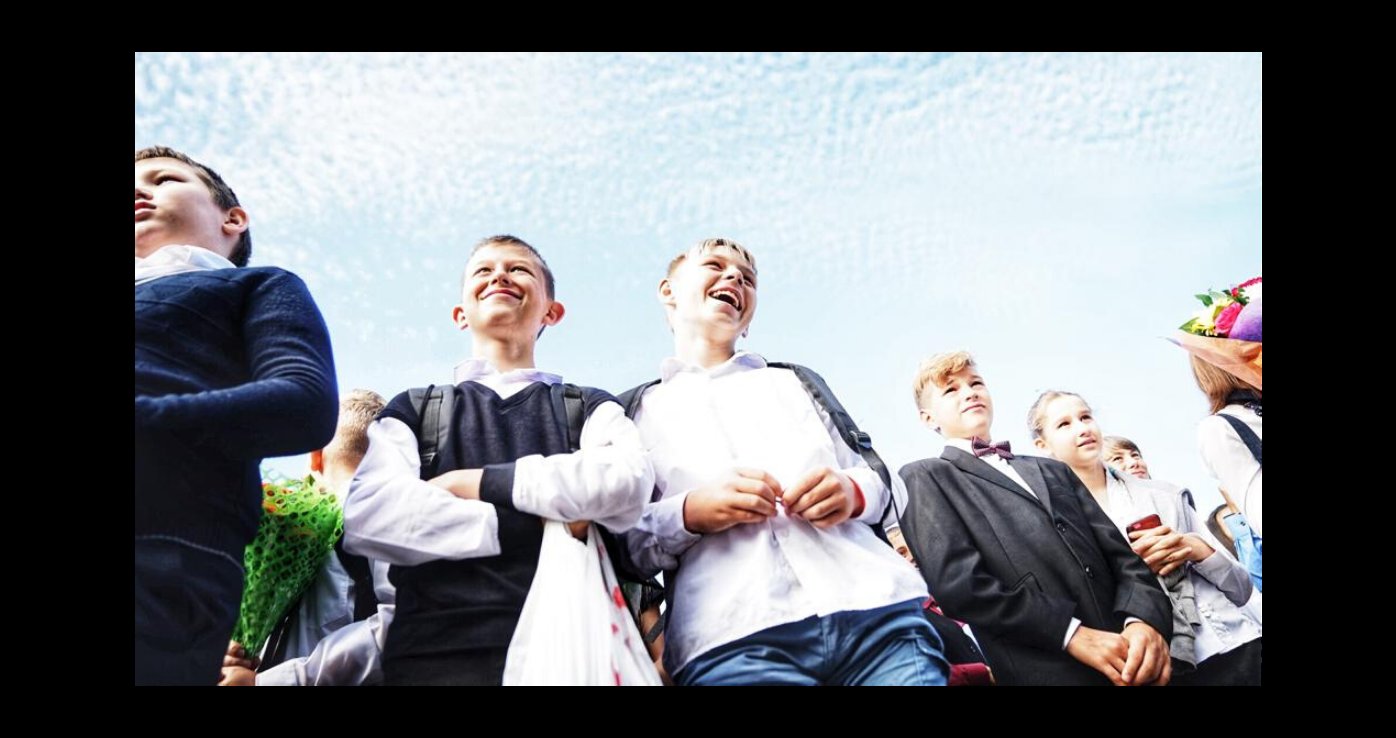 Тифлокомментарий: цветная фотография. Ясный день. Вид снизу на группу подростков, над ними яркое голубое небо. Два мальчика широко улыбаются, рядом с ними стоит юноша в классическом костюме с бабочкой.