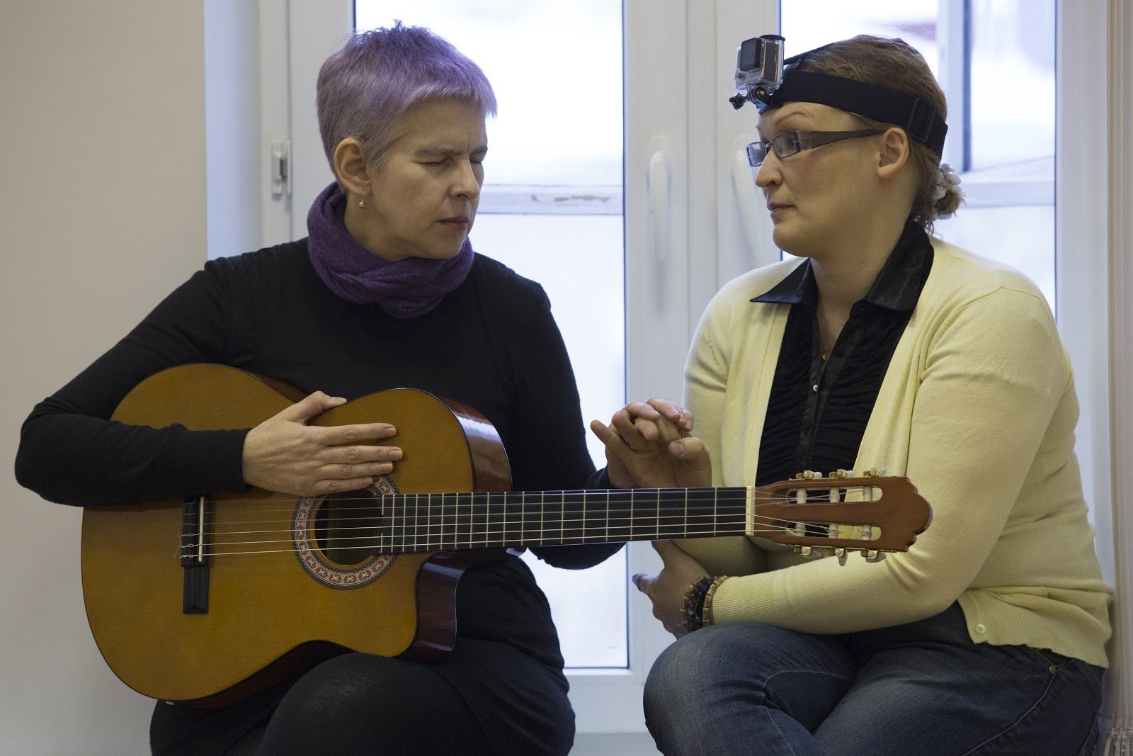 Тифлокомментарий: на фото изображены две женщины, сидящие на подоконнике. Слева — женщина средних лет с закрытыми глазами. У нее короткие фиолетовые волосы и мягкие черты лица. На ней фиолетовый шарф, черное платье, черные колготки и небольшие сережки в виде капелек. В руках у нее гитара. Справа — женщина с каштановыми короткими волосами, собранными в хвост белой резинкой. На голове у нее камера Go-Pro и очки. На ней черная рубашка, поверх которой тонкая желтая кофта, джинсы и три небольших деревянных браслета. Женщина с фиолетовыми волосами держится за тыльную сторону ладони второй женщины, и их головы повернуты друг к другу.