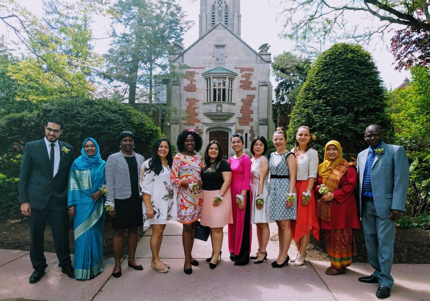 Тифлокомментарий: перед зданием Школы Перкинса стоят в шеренгу 12 человек разных национальностей, это группа стажеров ELP 2018. По бокам двое мужчин в костюмах с зелеными веточками на лацканах пиджака. Между ними женщины в разноцветных одеждах — платьях и сари. На руках у них браслеты из белых лент и зелени. Все смотрят в камеру и улыбаются.