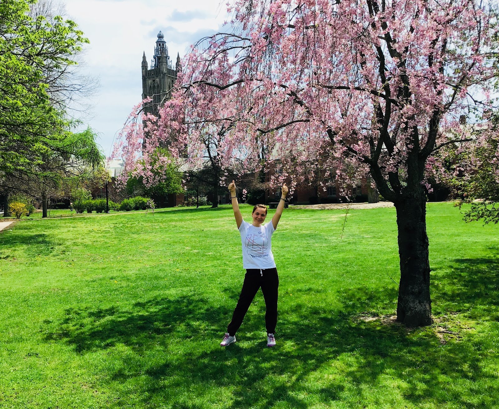Тифлокомментарий: зеленая лужайка недалеко от башни школны залита солнечным светом. Под цветущей сакурой розового цвета стоит улыбающаяся молодая девушка в белой футболке и черных брюках. Ее темные волосы убраны назад. Она протягивает руки вверх к цветущим веткам дерева, показывая знак «здорово»: кулаки сжаты, большие пальцы подняты вверх. Это Ксения Николаева.