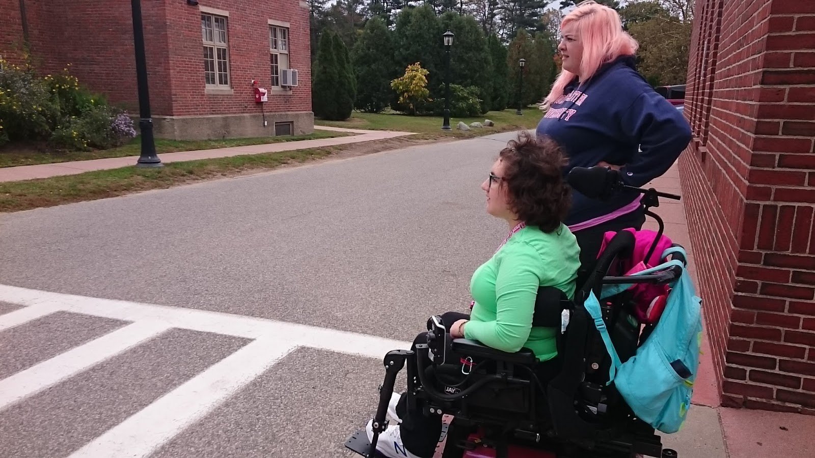 Тифлокомментарий: урок по ориентированию в пространстве. Перед пешеходным переходом через дорогу между двумя кирпичными зданиями стоят две девушки. Одна (с темными волосами, в очках и салатовой футболке) передвигается на электрическом кресле-коляске. Вторая (полная, с розовыми волосами, в спортивном костюме) стоит рядом.