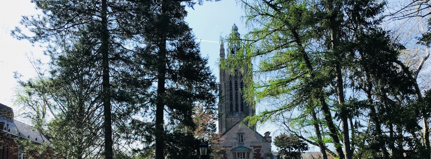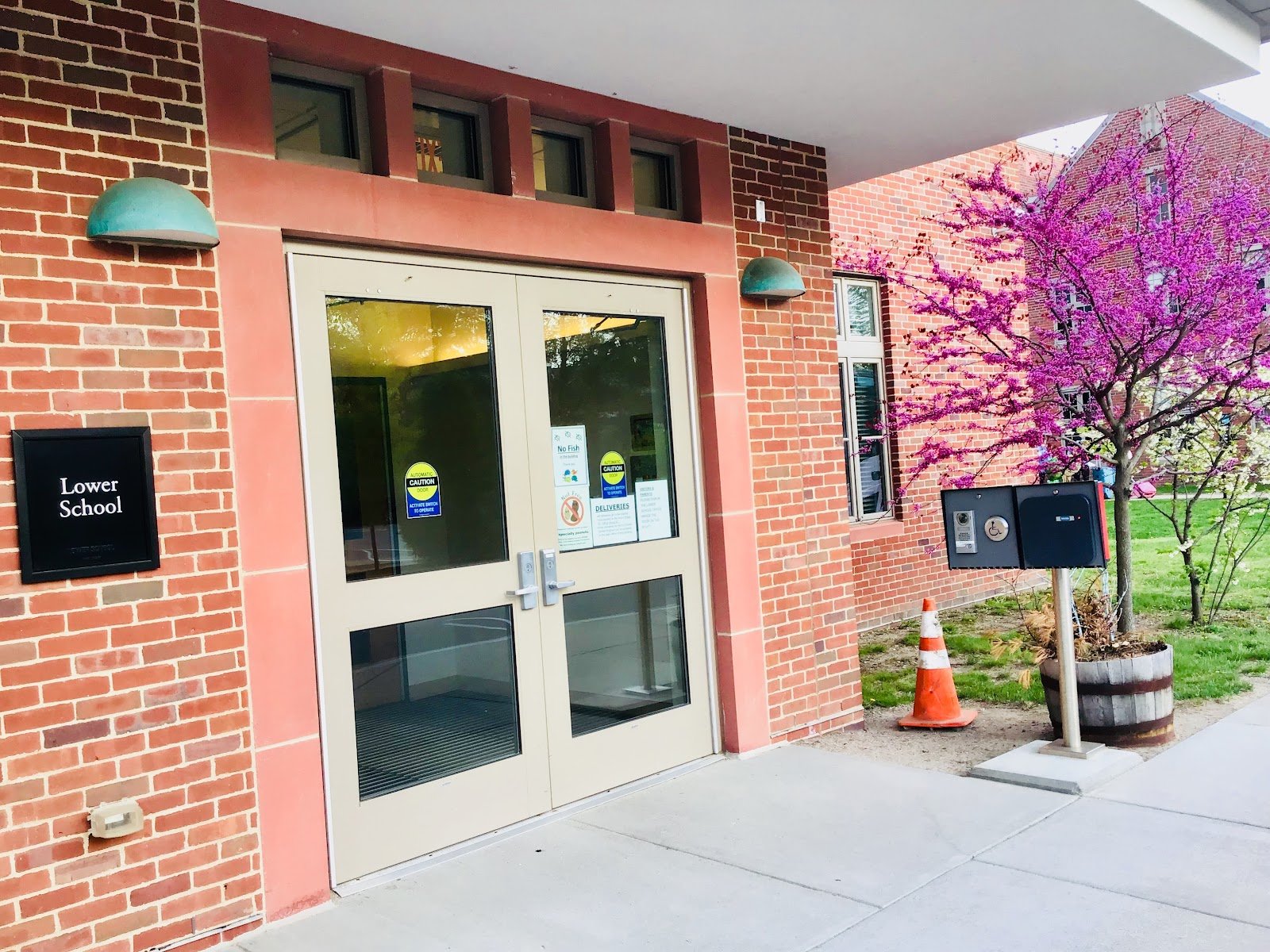 Тифлокомментарий: главный вход в учебный корпус. Большие стеклянные двери в кирпичном здании. Вход сделан вровень с землей. Над дверьми расположены подряд четыре небольших окна. Слева от дверей надпись: Lower school. Справа — переговорное устройство с большой круглой кнопкой, на которой нарисован человек на кресле-коляске. За ним дерево с яркими лиловыми цветами.
