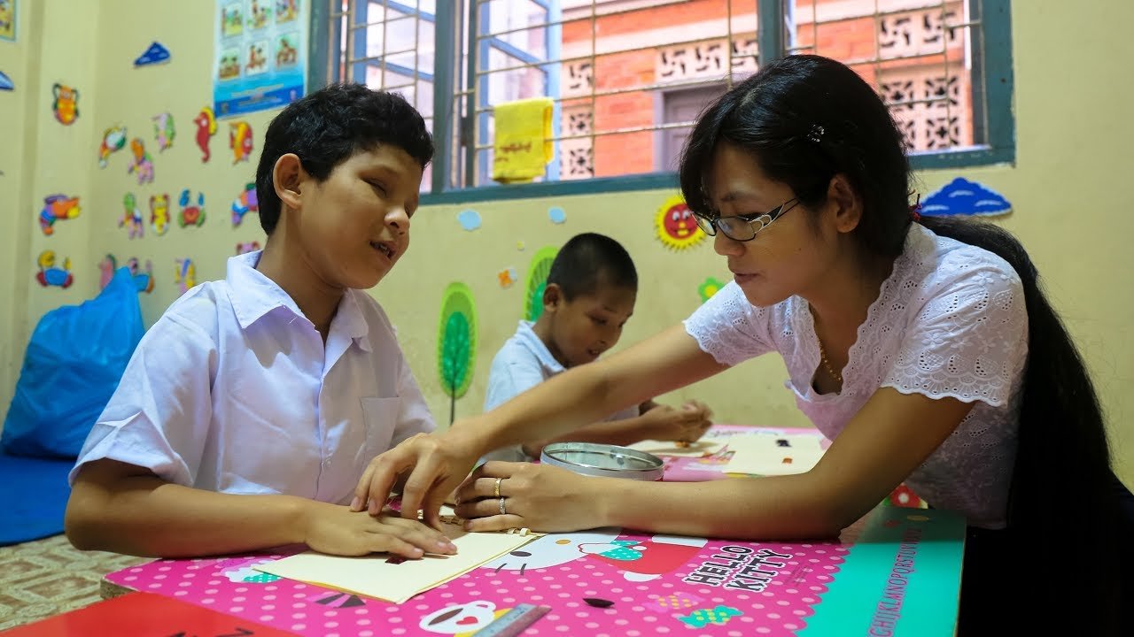Тифлокомментарий: на фото девушка в очках и белой ажурной блузке с длинными густыми черными волосами сидит за столом перед мальчиком, у которого закрыты глаза. На нем белая рубашка с короткими рукавами. Девушка кладет свои ладони на его пальцы. Чуть позади сидит еще один мальчик. Все они азиатской внешности, находятся в помещении с желтыми стенами в ярких детских наклейках.