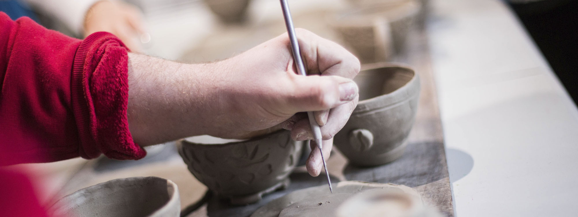 Тифлокомментарий: цветная фотография. На деревянном столе стоят керамические чаши и глиняная заготовка. Мужчина в красной кофте заносит над ней руку с шилом.