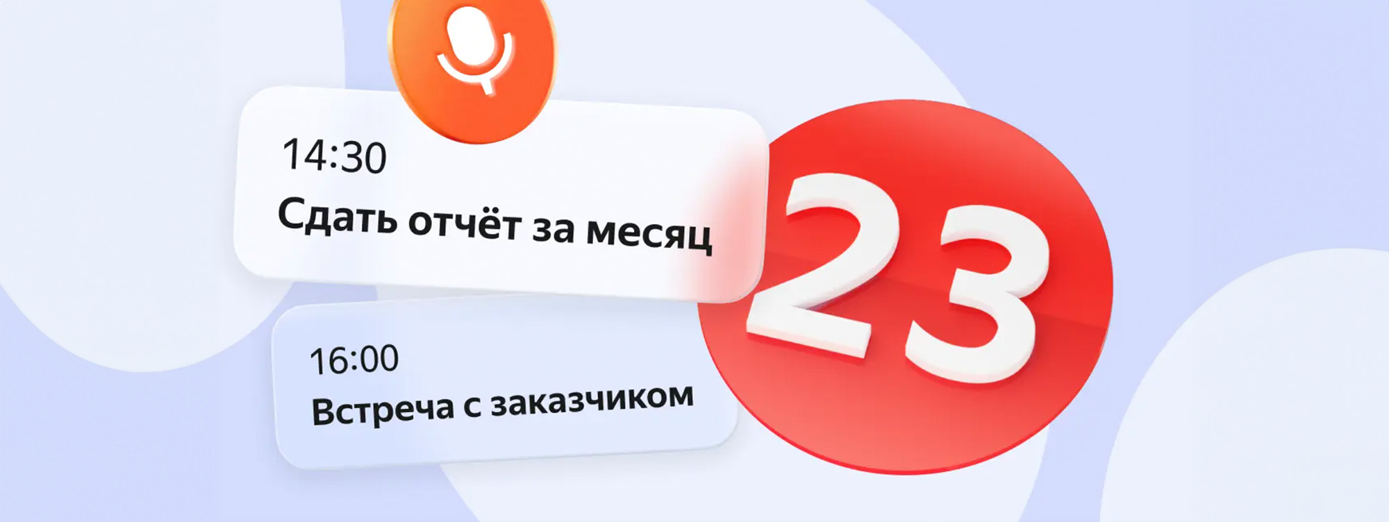 Тифлокомментарий: цветной коллаж. На голубом фоне с полупрозрачными кругами расположены иконка голосовой записи в виде белого микрофона в красном круге, две запланированные на определенное время задачи в виде черных надписей в белых прямоугольниках: «Сдать отчет за месяц» и «Встреча с заказчиком», а также иконка с датой — цифра 23 в красном круге.