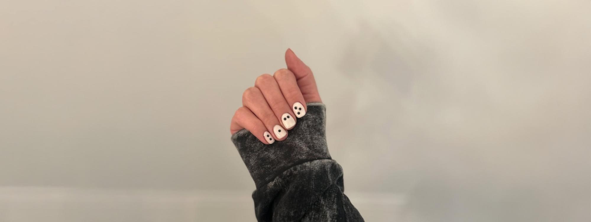 Тифлокомментарий: цветная фотография. На светло-сером фоне женская правая рука с маникюром. Короткие ногти квадратной формы покрыты белым лаком. Черными стразами на них выложены слова рельефно-точечным шрифтом. По одной, две и три стразы на каждом ногте в разных конфигурациях.