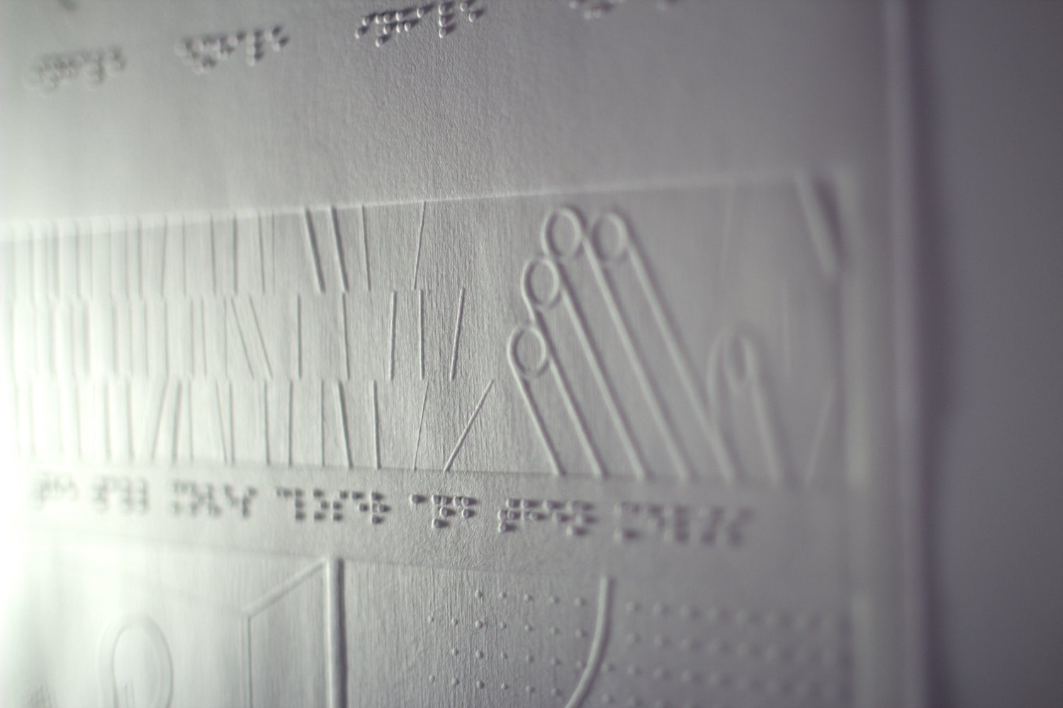 В книжной версии «Блайндмена» объемное изображение, выполненное тиснением на бумаге, сопровождается поэтическими строками, напечатанными шрифтом Брайля.