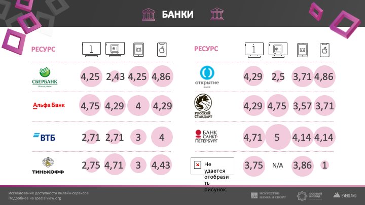 Банк ВТБ. Доступность интернет-банкинга и информационной части части ниже среднего. Средняя доступность приложения на Android, высокая — приложения на iOS.