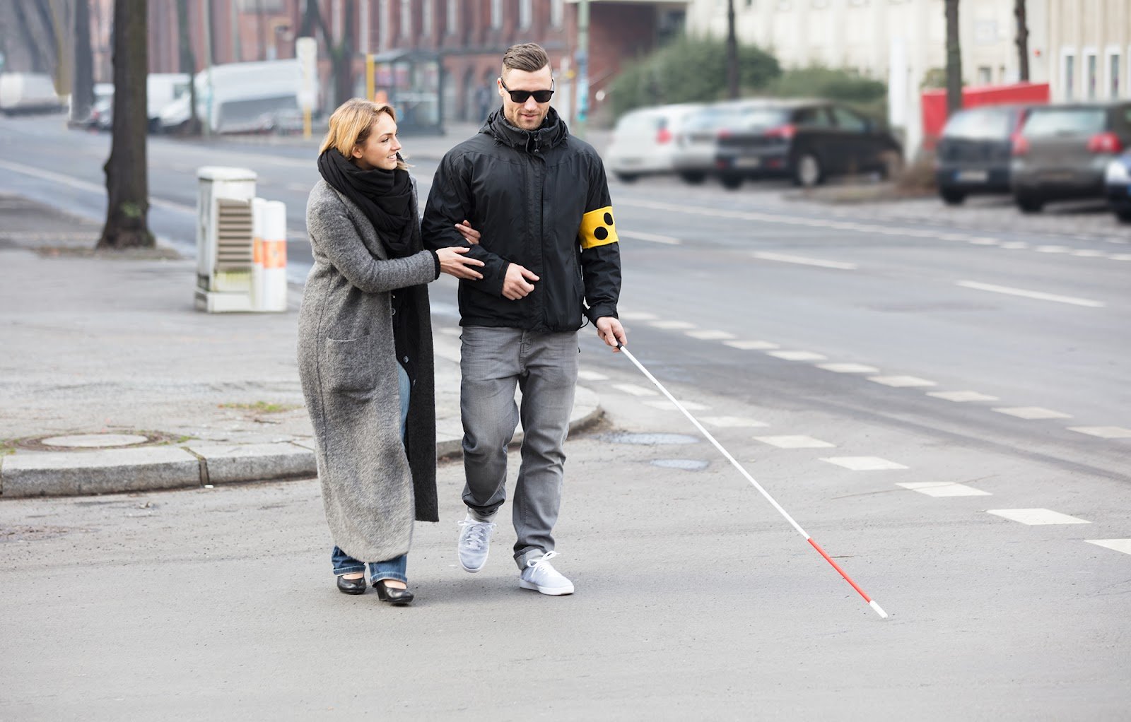 Тифлокомментарий к фотографии: пешеходный переход пересекают девушка под руку с молодым высоким мужчиной в темных очках. У девушки русые волосы до плеч, на ней серое длинное шерстяное пальто, синие джинсы, черные туфли на низком каблуке и черный шарф, спускающийся почти до земли. Девушка слегка наклонилась вперед и влево, улыбается. Мужчина в черной куртке, серых джинсах и белых кроссовках держит в левой руке длинную белую трость с красной полосой и белым цилиндрическим наконечником. На левом рукаве на локте у него желтая повязка с изображением черных очков. У него прическа с выбритыми висками и легкая щетина, он улыбается так, что появляются ямочки на щеках.