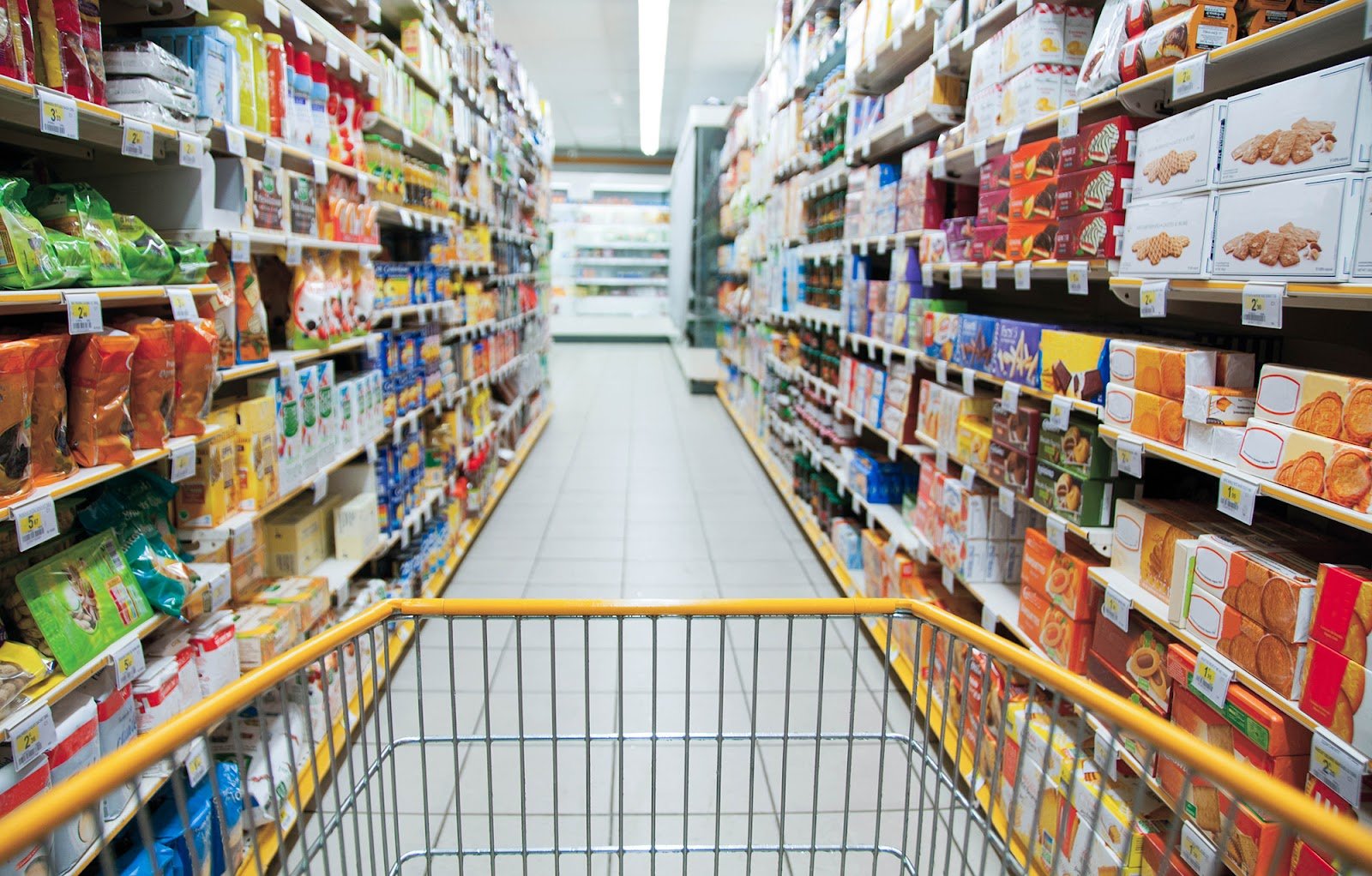 Тифлокомментарий к фотографии: торговый зал супермаркета. По одному из рядов едет покупательская тележка: виден только край сетчатой металлической корзины с желтой окантовкой. По бокам - витрины-стеллажи, на которых стоят товары в ярких разноцветных упаковках, под товарами висят ценники.