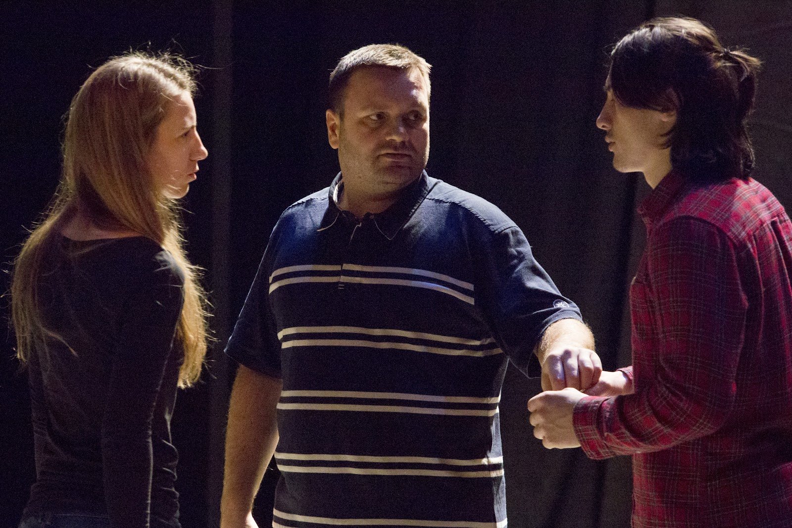 Тифлокомментарий: цветная фотография. На темном фоне три фигуры. Слева боком к зрителю стоит девушка в темной кофте с длинными светлыми волосами. В центре крупный темноволосый мужчина средних лет в синей футболке с белыми горизонтальными полосками. И девушка, и мужчина смотрят на стоящего справа юношу, мужчина положил левую руку на его руки, сведенные вместе перед собой. На юноше малиновая фланелевая рубашка в фиолетовую клетку. Его прямые густые волосы до плеч частично забраны в хвостик на затылке.
