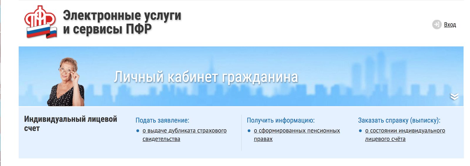 Тифлокомментарий: изображение интернет-страницы личного кабинета на сайте Пенсионного фонда России. Сверху знак ПФР с российским флагом и надпись: «Электронные услуги и сервисы ПФР». Справа сверху кнопка «Вход». Чуть ниже слева фотография женщины пенсионного возраста в очках с короткой прической на фоне силуэтов высотных домов. Надпись на голубом фоне белыми буквами: «Личный кабинет гражданина». Чуть ниже слева направо заголовки: «Индивидуальный лицевой счет», «Подать заявление: о выдаче дубликата страхового свидетельства», «Получить информацию: о сформированных пенсионных правах», «Заказать справку (выписку): о состоянии индивидуального лицевого счета».