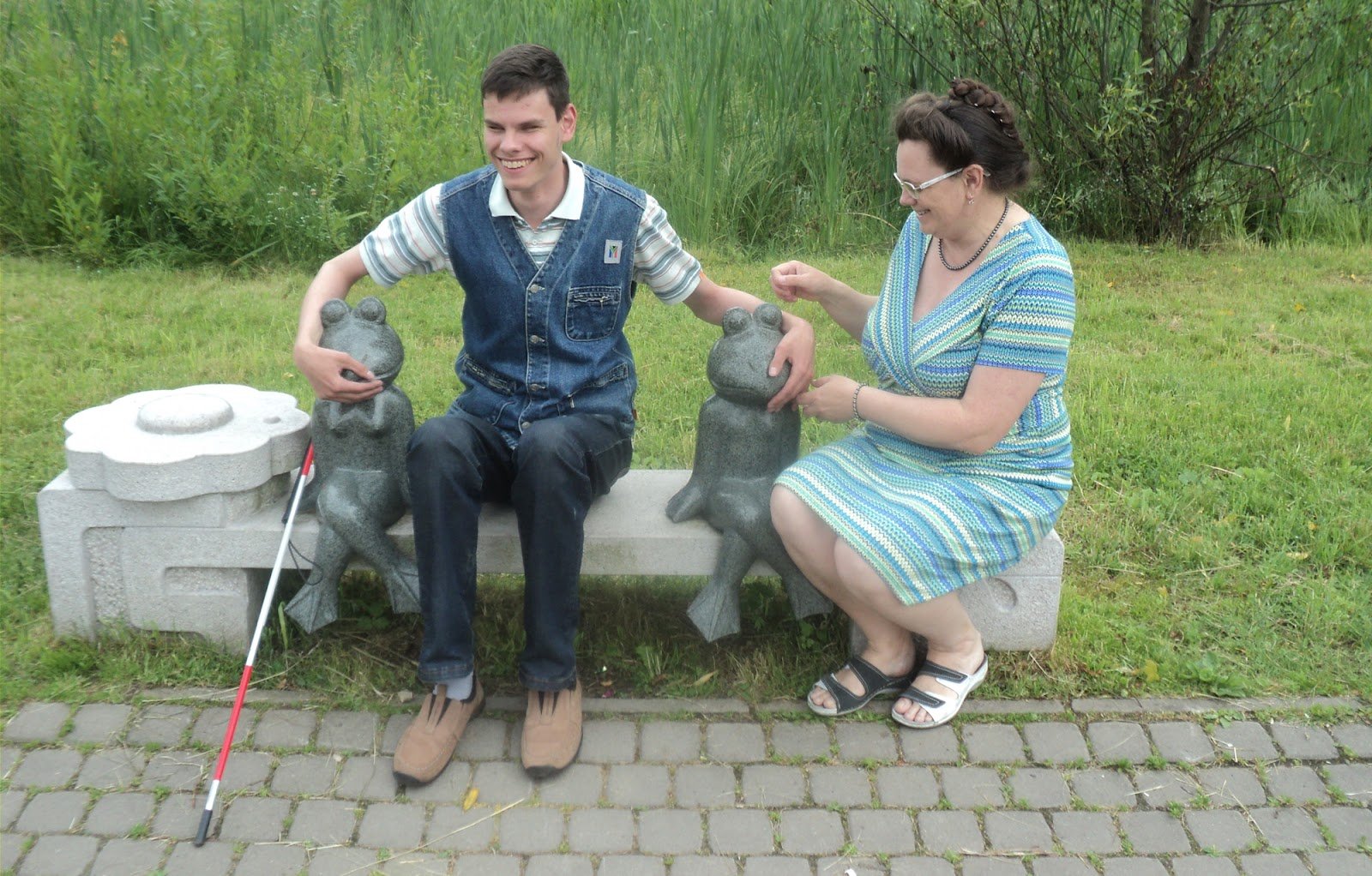 Тифлокомментарий: на цветной фотографии дорожка, выложенная мелкой квадратной плиткой. За ней начинается газон, еще дальше кусты. Рядом с дорожкой бетонная лавочка со скульптурами двух сидящих лягушат. Между ними сидит Коля Антонцев. Он держит руки на мордочках зверюшек. На нем полосатая рубашка с короткими рукавами, джинсовая жилетка и темные штаны, на ногах бежевые ботинки. Справа от него лежит трость. Коля улыбается. Слева от него сидит женщина среднего возраста в летнем полосатом платье и босоножках. Ее темные волосы убраны в высокую прическу. Она смотрит на одного из лягушат и тоже улыбается. Это мама Коли Антонцева Юлия.
