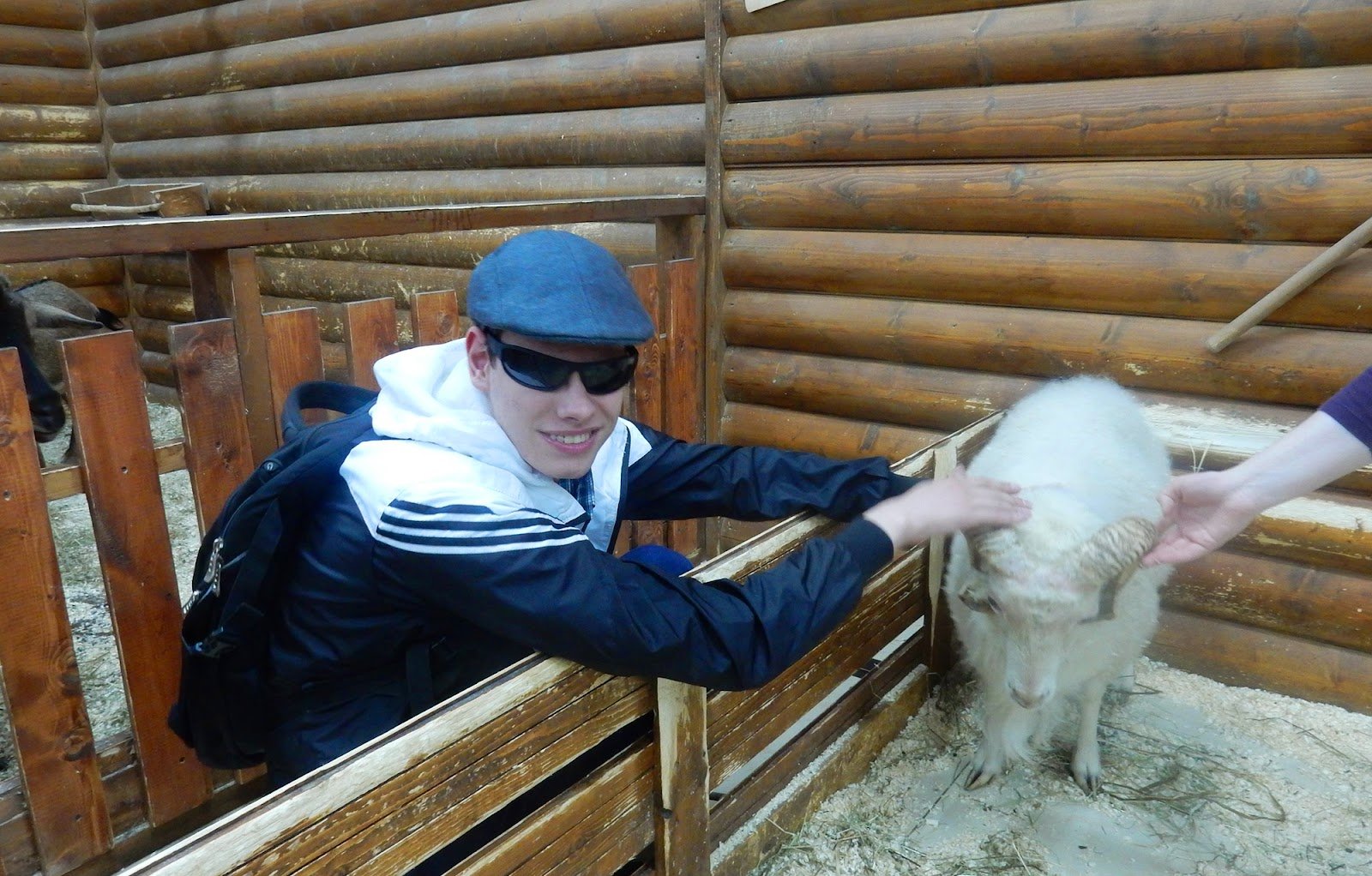Тифлокомментарий: Коля в черный очках, синей кепке и синей с белым ветровке, с рюкзаком за плечами. Перед ним огороженный подиум, на котором стоит овца, Коля трогает ее за рог.