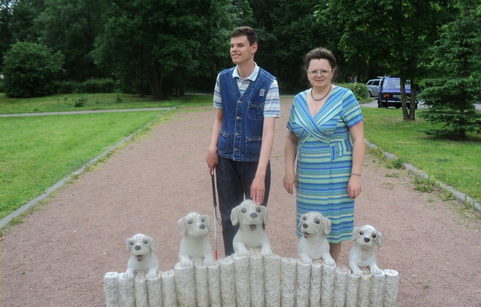 Тифлокомментарий: Коля с мамой Юлией на дорожке в парке. Перед ними небольшая скульптурная композиция: пять собачек стоят за забором, положив на него передние лапы. Коля трогает голову собаки по центру.