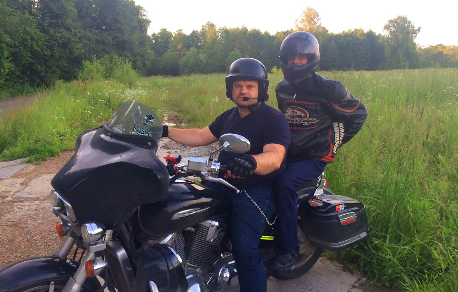 Тифлокомментарий: на каменной площадке у опушки леса стоит мотоцикл. На переднем сиденье расположился плотный мужчина среднего возраста в темной футболке, джинсах и мотоциклетном шлеме. Он держится за руль. На пассажирском сиденье - Коля тоже в мотоциклетном шлеме и темной кожаной куртке.