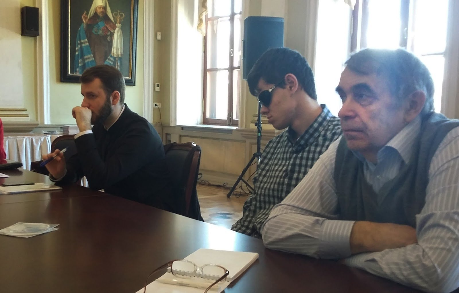 Тифлокомментарий: трое мужчин сидят за длинным деревянным столом в просторной, освещенной ярким солнцем комнате с большими окнами. На переднем плане пожилой мужчина в полосатой рубашке и вязаной жилетке. Это Вячеслав Озеров. Он перекрестил руки и поставил их на стол. Перед ним лежит блокнот с ручкой и очки. Рядом сидит Коля в клетчатой рубашке и черных очках. Чуть дальше - молодой мужчина в черном пиджаке и белой рубашке. У него темные волосы и аккуратно подстриженная борода. Он держит в руке ручку, перед ним лежит бумага.