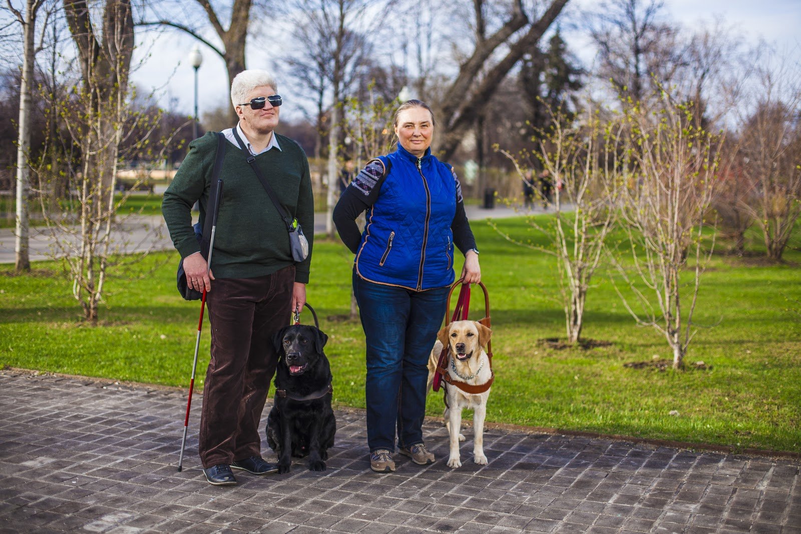 Тифлокомментарий: в этом же месте с этими же собаками стоят двое людей. Слева с черным лабрадором стоит мужчина среднего возраста с седыми волосами. На нем черные очки, зеленый свитер, коричневые брюки, две сумки на плечах. В правой руке трость. Рядом с ним стоит круглолицая женщина, чуть ниже него, с убранными назад волосами. Она слегка улыбается, глядя в камеру. На ней темный свитер, поверх него синяя безрукавка и джинсы. Правую руку женщина держит за спиной. Оба в левой руке держат шлейку и поводок лабрадоров. Светлый лабрадор стоит, черный сидит.