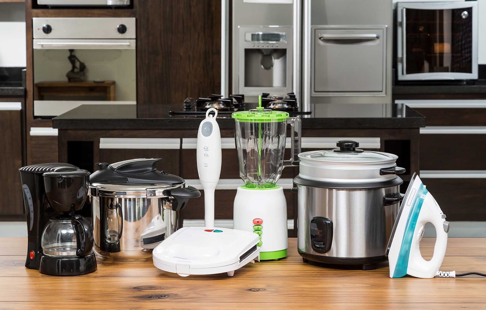 Тифлокомментарий: кухня. На кухонном острове с деревянной столешницей бытовая техника. Слева направо: черная капельная кофеварка, мультиварка c черной крышкой и ручками, белый сэндвич-тостер, белый погружной блендер, стационарный бело-зеленый блендер, матовая хромированная пароварка с двумя чашами и белый утюг с голубым отделением для воды. За кухонным островом — отдельно стоящий деревянный стол со встроенной в каменную столешницу газовой плитой. За столом — темные кухонные шкафы со встроенной техникой.
