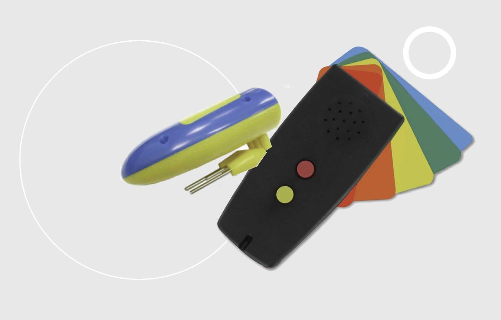 Тифлокомментарий: цветной фотоколлаж. Светло-серый фон с белыми кругами На фоне в центре — индикатор уровня жидкости «Помощник ПМ-305». Это небольшое сине-желтое устройство в форме моторной лодочки с тремя металлическими щупами. Справа от него говорящий определитель цвета Colorino. У него темно-серый трапециевидный корпус с круглым динамиком в верхней части и двумя круглыми кнопками красного и желтого цвета посередине. Под определителем разложены веером полоски картона разных цветов.