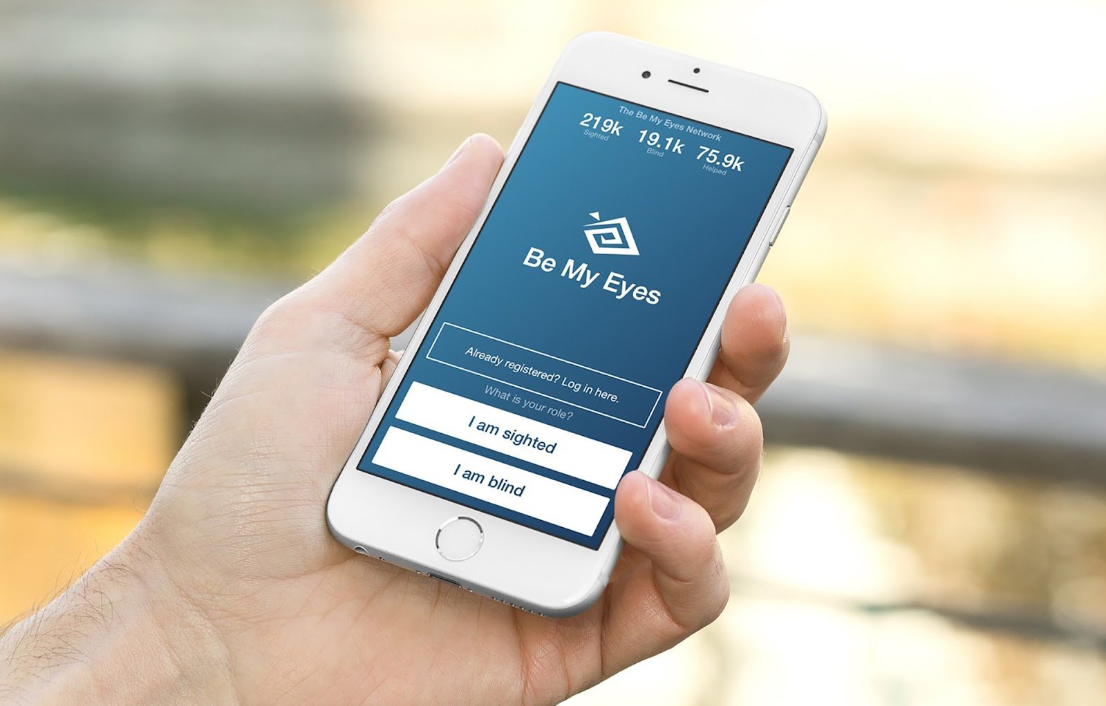 Тифлокомментарий: цветная фотография. Рука держит смартфон с белым корпусом. На экране заставка приложения Be My Eyes. На фоне цвета морской волны логотип приложения белого цвета: ромбовидная спираль, похожая на схематичное изображение глаза со зрачком. Ниже надпись белыми буквами: Be My Eyes. Над логотипом в верхней части экрана данные о количестве зрячих и незрячих пользователей, а в нижней части — кнопки для входа и регистрации.