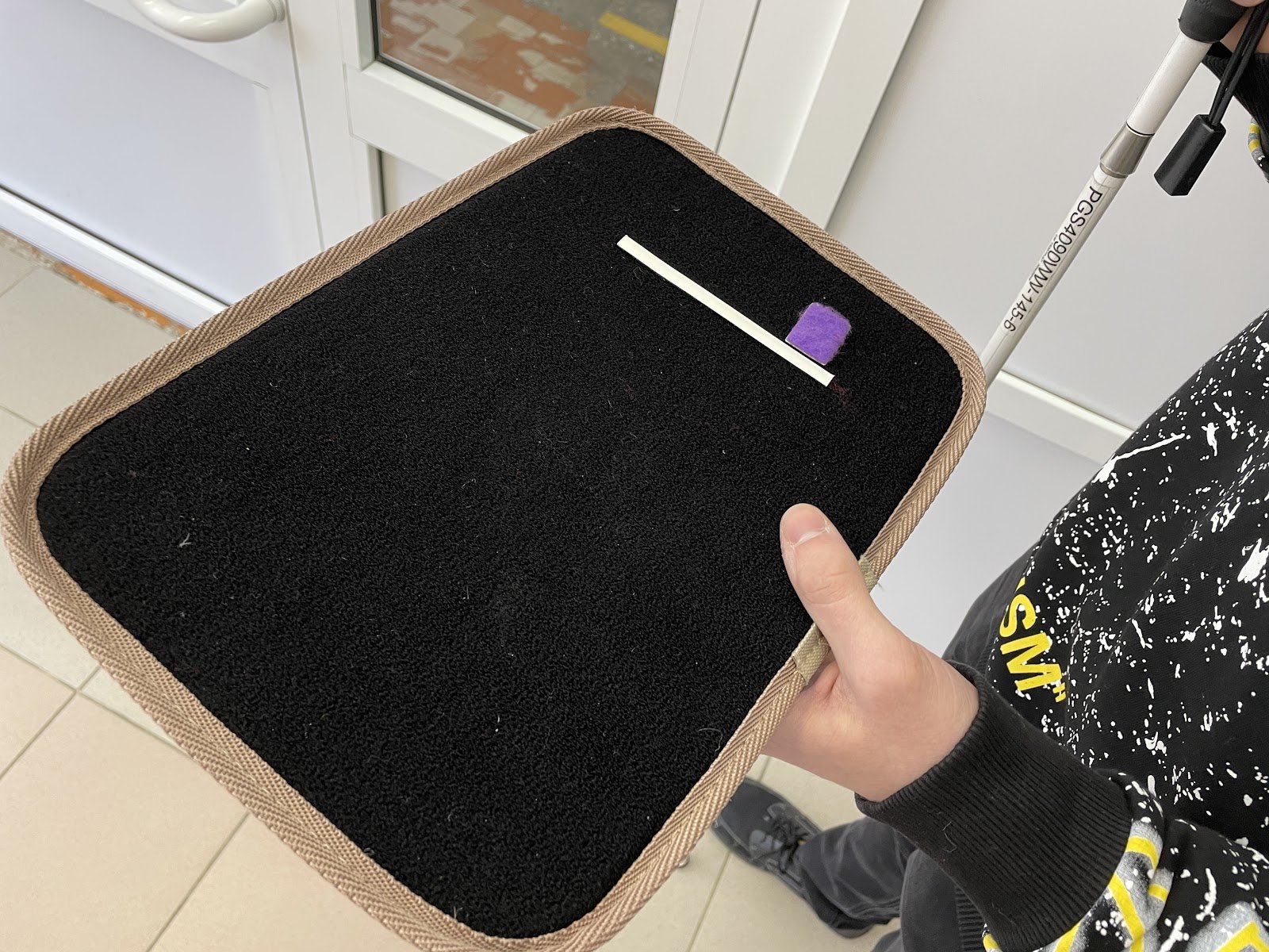 Тифлокомментарий: цветная фотография. У двери стоит человек, опирающийся на белую трость. В его руке рельефная карта. На черном полотне карты белая полоска, справа от которой небольшой сиреневый прямоугольник.