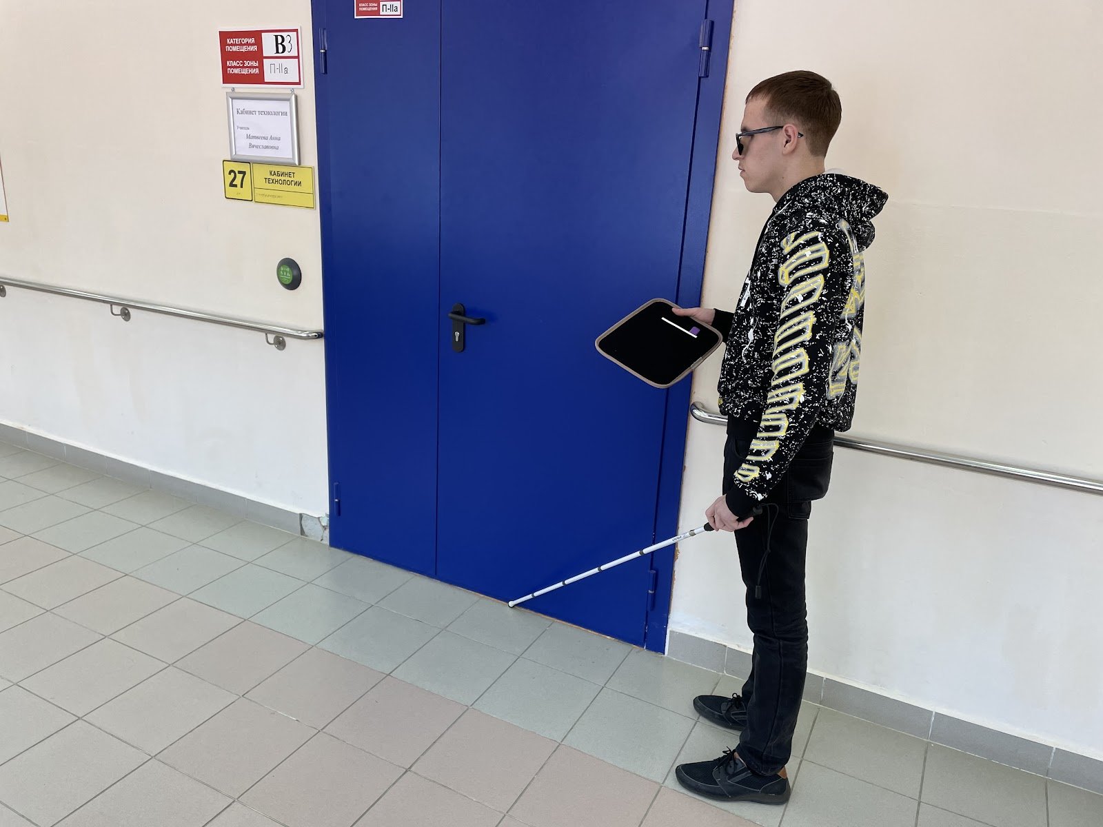 Тифлокомментарий: цветная фотография. В коридоре у двери стоит молодой человек в темных очках. В его правой руке рельефная карта, в левой — белая трость, которой он касается порога.