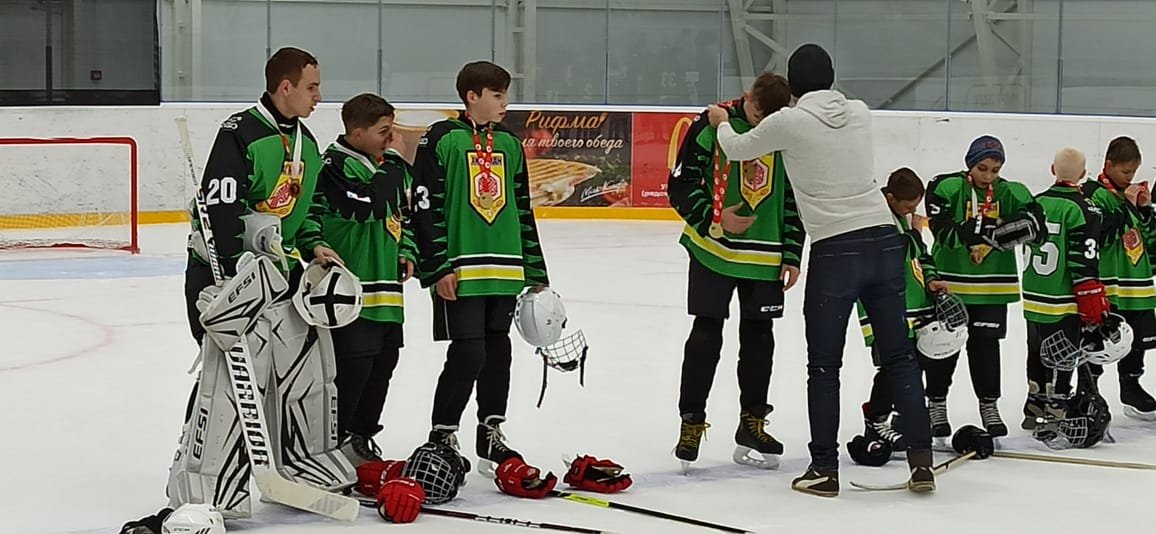 Тифлокомментарий: цветная фотография. Церемония награждения. На хоккейном поле в ряд выстроились дети в экипировке зеленого цвета. Среди них и вратарь Иван Железнов. Мужчина в черных джинсах и белой толстовке надевает медаль одному из спортсменов.