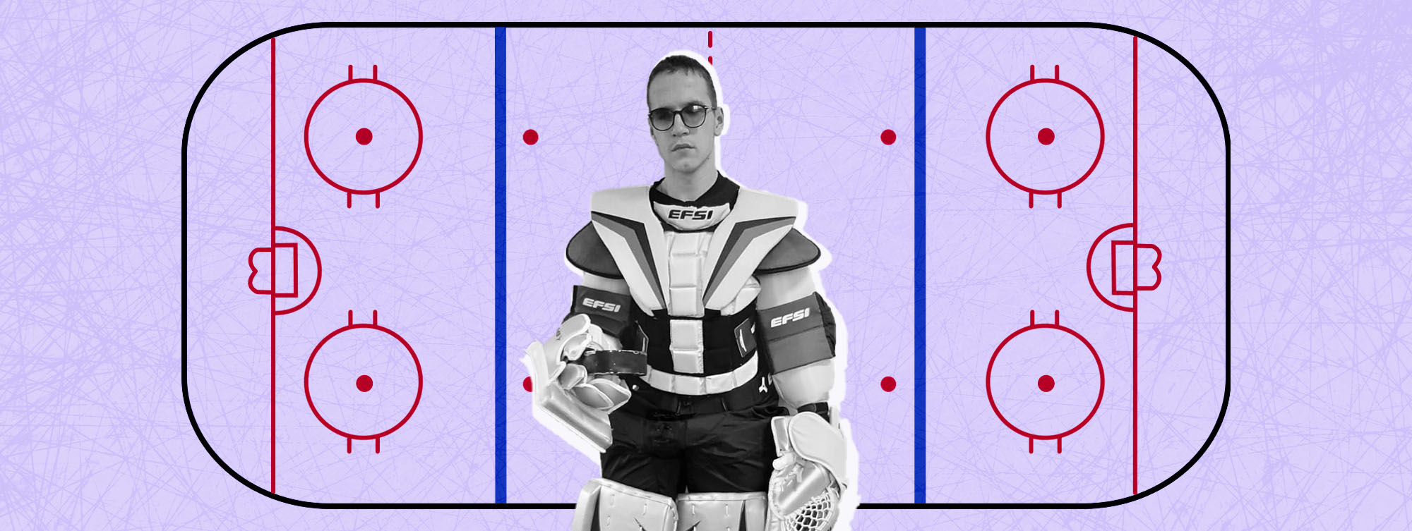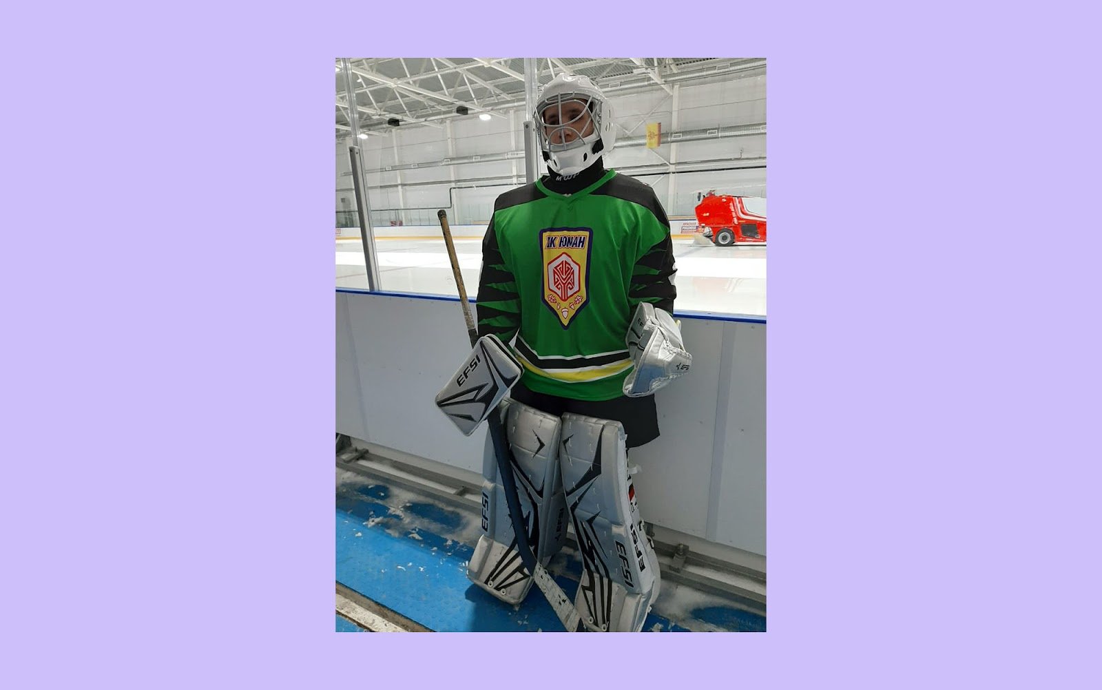 Тифлокомментарий: цветная фотография на фиолетовом фоне. Иван в полной вратарской экипировке стоит у борта хоккейной площадки. На голове шлем, поверх нагрудника зеленая футболка с логотипом команды, в руках клюшка.
