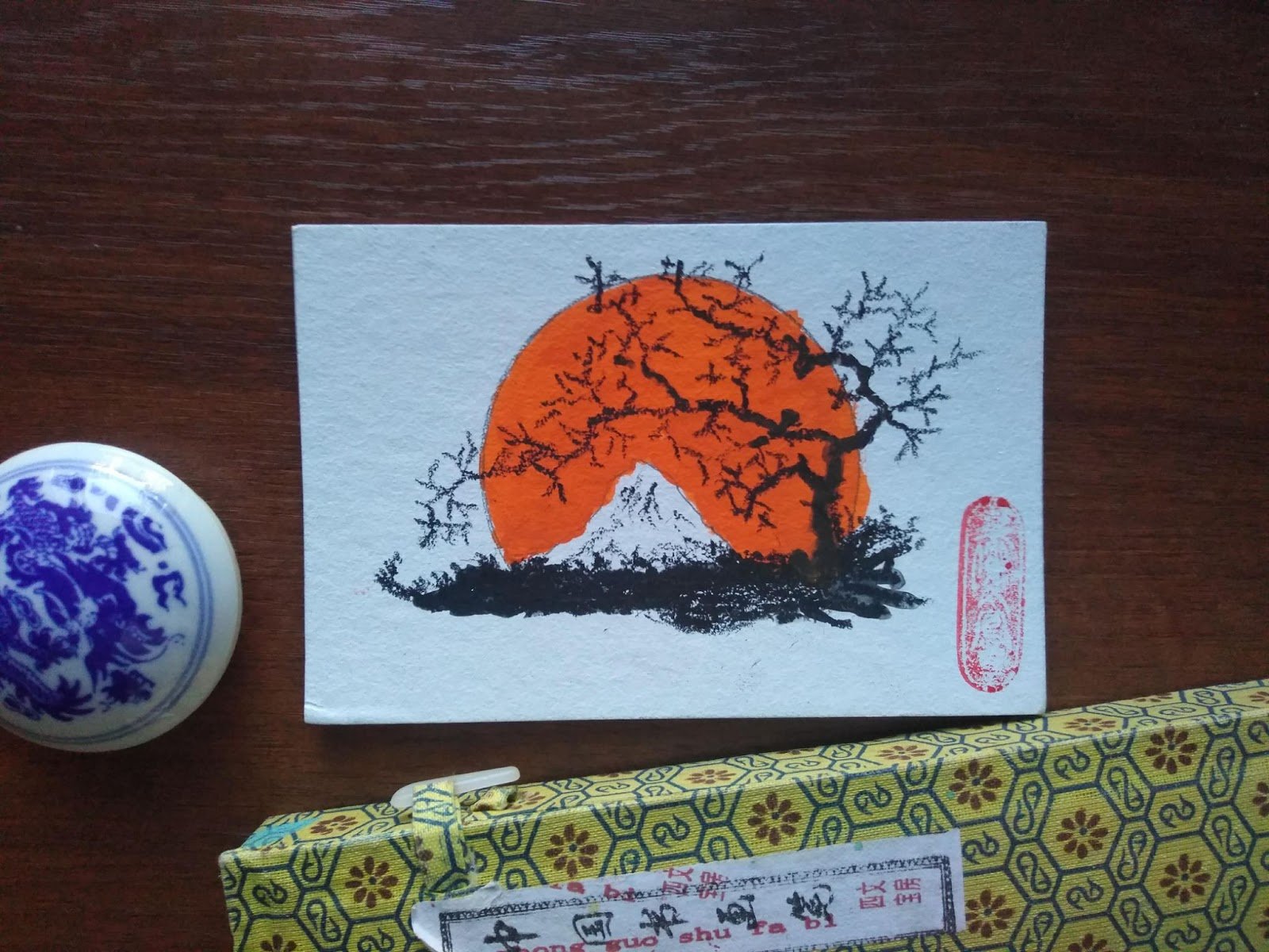 Тифлокомментарий: цветная фотография. На столе лежит рисунок в стилистике китайской живописи. На плотной белой бумаге небольшого формата изображены белая гора и ветвистое черное дерево, на фоне — оранжевый диск солнца. В правом нижнем углу рисунка — оттиск красной резной китайской печати. Слева от рисунка стоит круглая фарфоровая чернильница, внизу — набор для каллиграфии в цветной коробке.