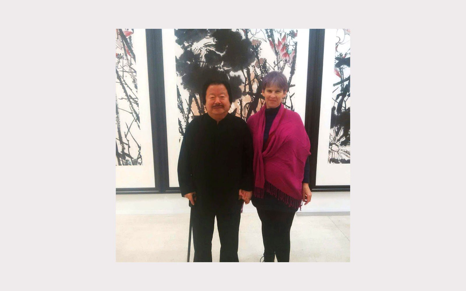 Тифлокомментарий: цветная фотография. Выставка картин. Ирина Поволоцкая и художник Цуй Жучжо стоят рядом, взявшись за руки, улыбаются. Ирина одета в черную водолазку и брюки, на плечи она накинула яркий малиновый палантин. Цуй, плотного телосложения мужчина в черном костюме, опирается на трость. Черно-белые картины позади них занимают все пространство от пола до потолка.
